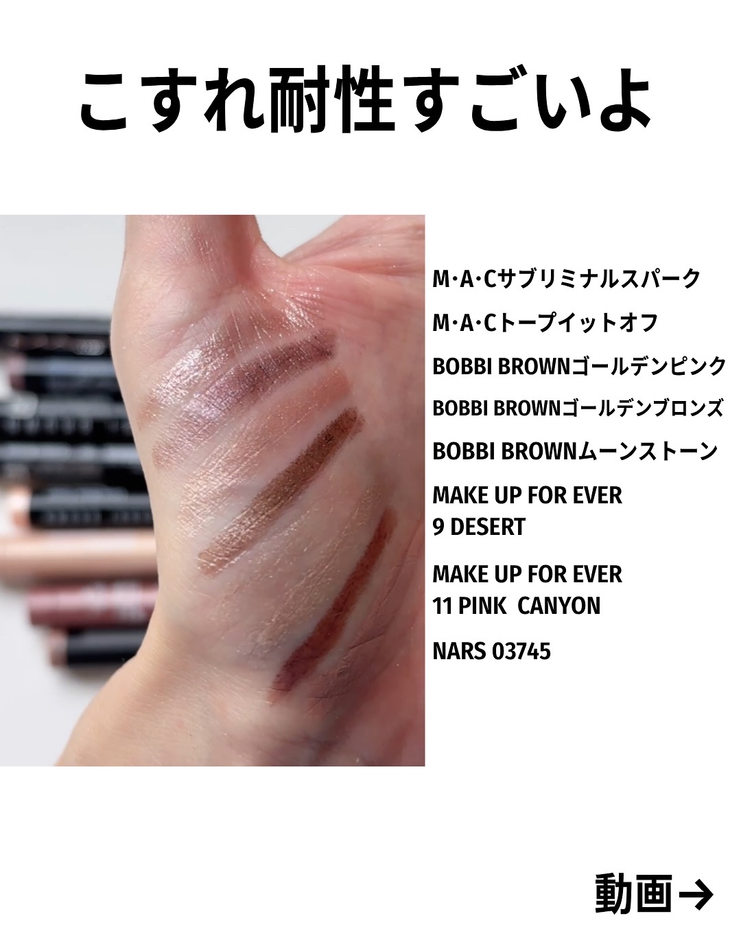 質感:マルチクロム ホワイトゴールド系 ラメが綺麗なカラー 色味よりも輝きがメイン (重ねると少しベースカラーあり) まぶた中央の上下や目頭エリアに使うと可愛い リュクスアイシャドウでも人気No1カラー 定着すると崩れにくく擦れにも強いシャドウスティック のせてすぐであればぼかせます