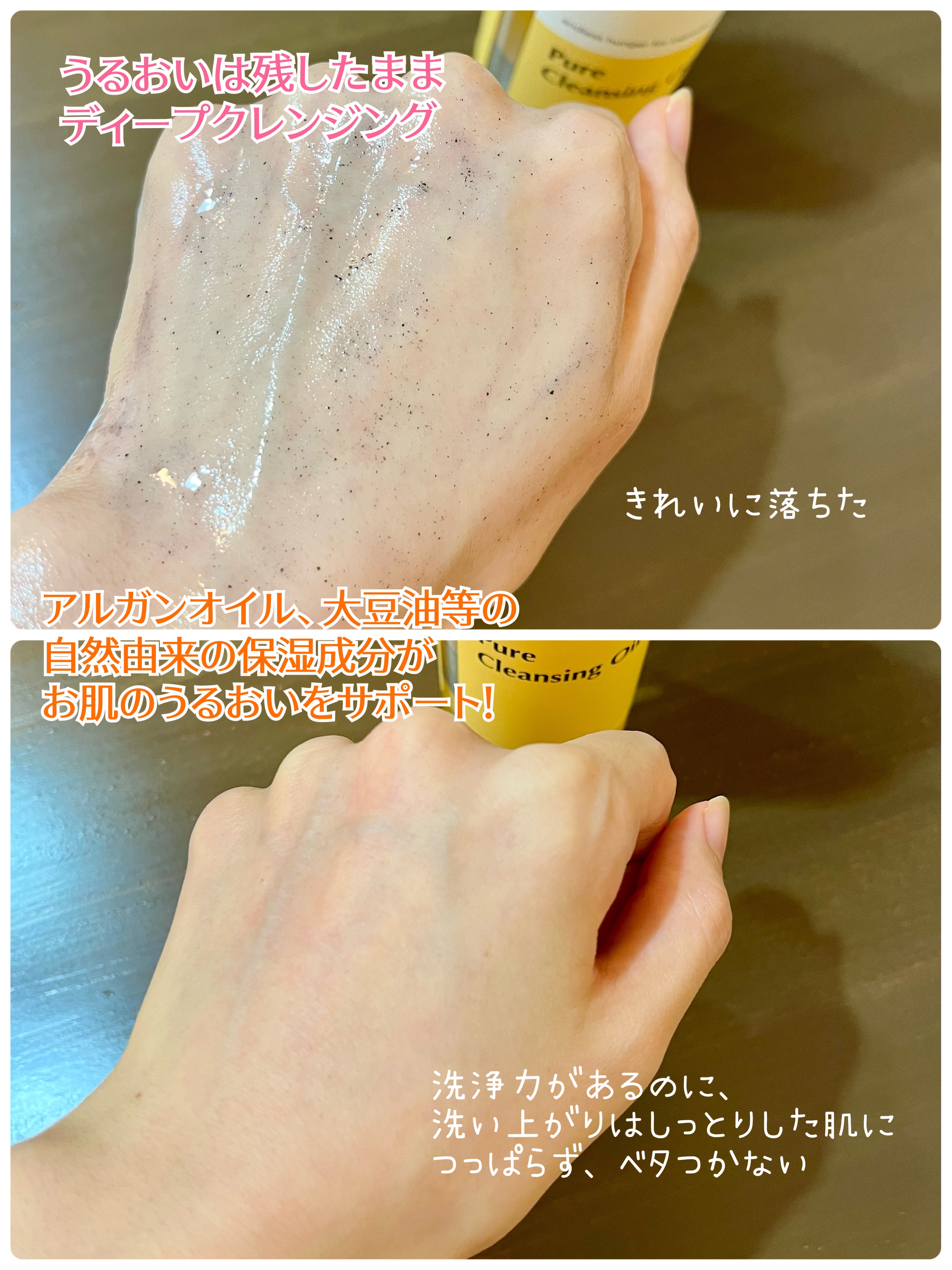 - 「ピュアクレンジングオイル」は、99.9%自然由来で目に沁みず、肌に優しいクレンジングオイルです。ホホバオイルなど14種類の植物性オイルを配合。人間の皮脂に近いホホバオイルは角質に浸透しやすく、毛穴に詰まった皮脂汚れを溶かし出すのに有効的です。メイクや毛穴の汚れまでをしっかりと溶かし、水に触れると乳化するオイルが、汚れをすっきりと洗い流します。自然由来の保湿成分だからこそ、「洗いあがりもつっぱらずにしっとり」と評判を呼び、累積販売175万本を突破!PM2.5、黄砂など、大気中の目には見えない細かな汚れまで99.73%しっかりと洗い流せます。