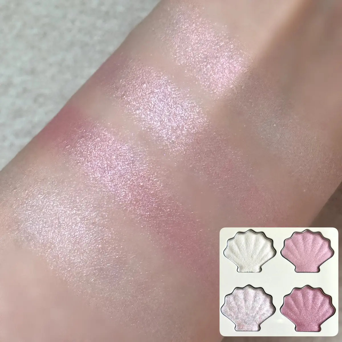 アイシャドウは一見難しそう…と思ったけど、右2色はベーシックなカラーで使いやすい! 左上のパープルは色が強く出すぎずキラキラが乗る感じだったので、イエベの私でも問題なく使えたよ🙆♀️︎ ハイライターは見た目よりも肌馴染みがよく、近づくとちらちらラメが見える仕上がりだった✨️
