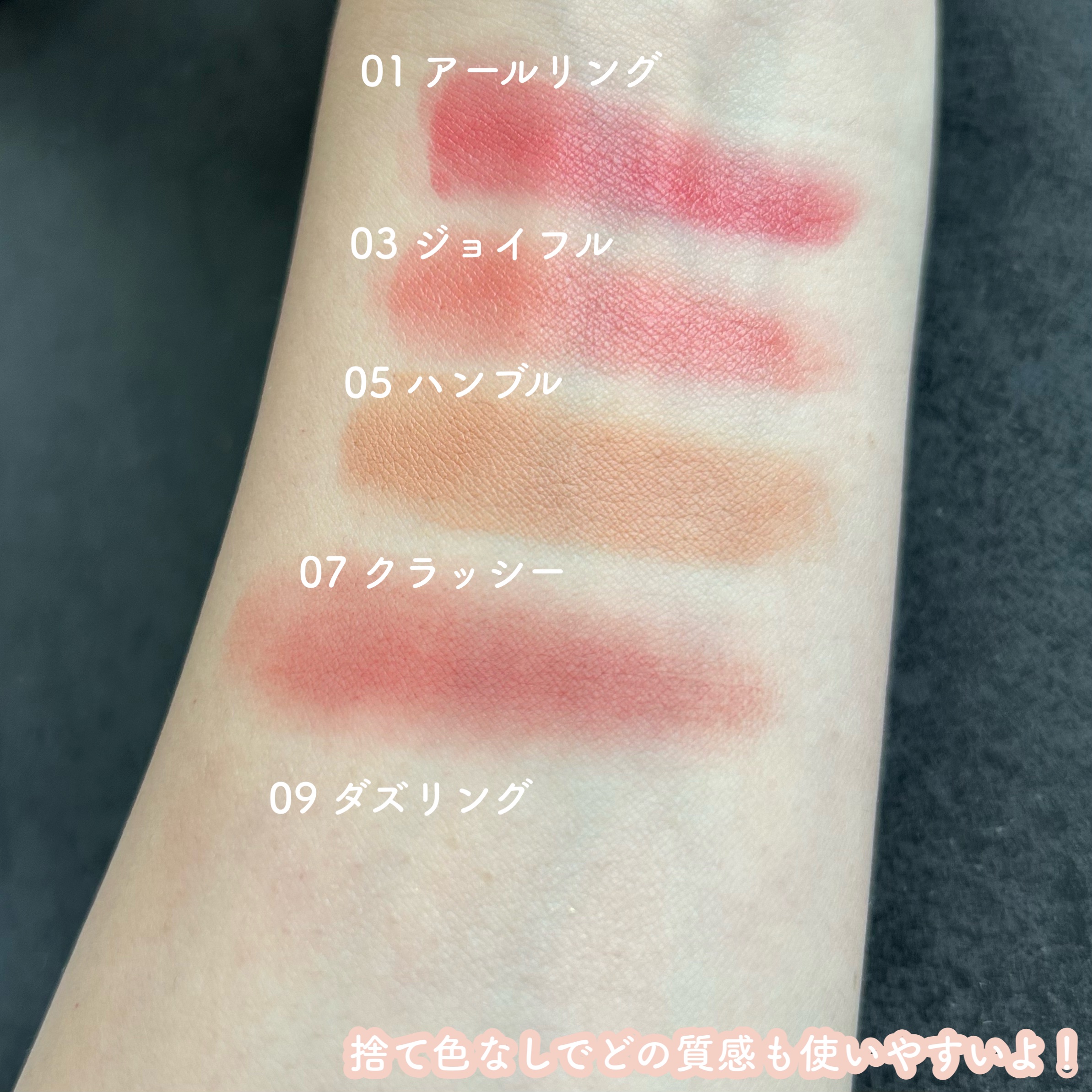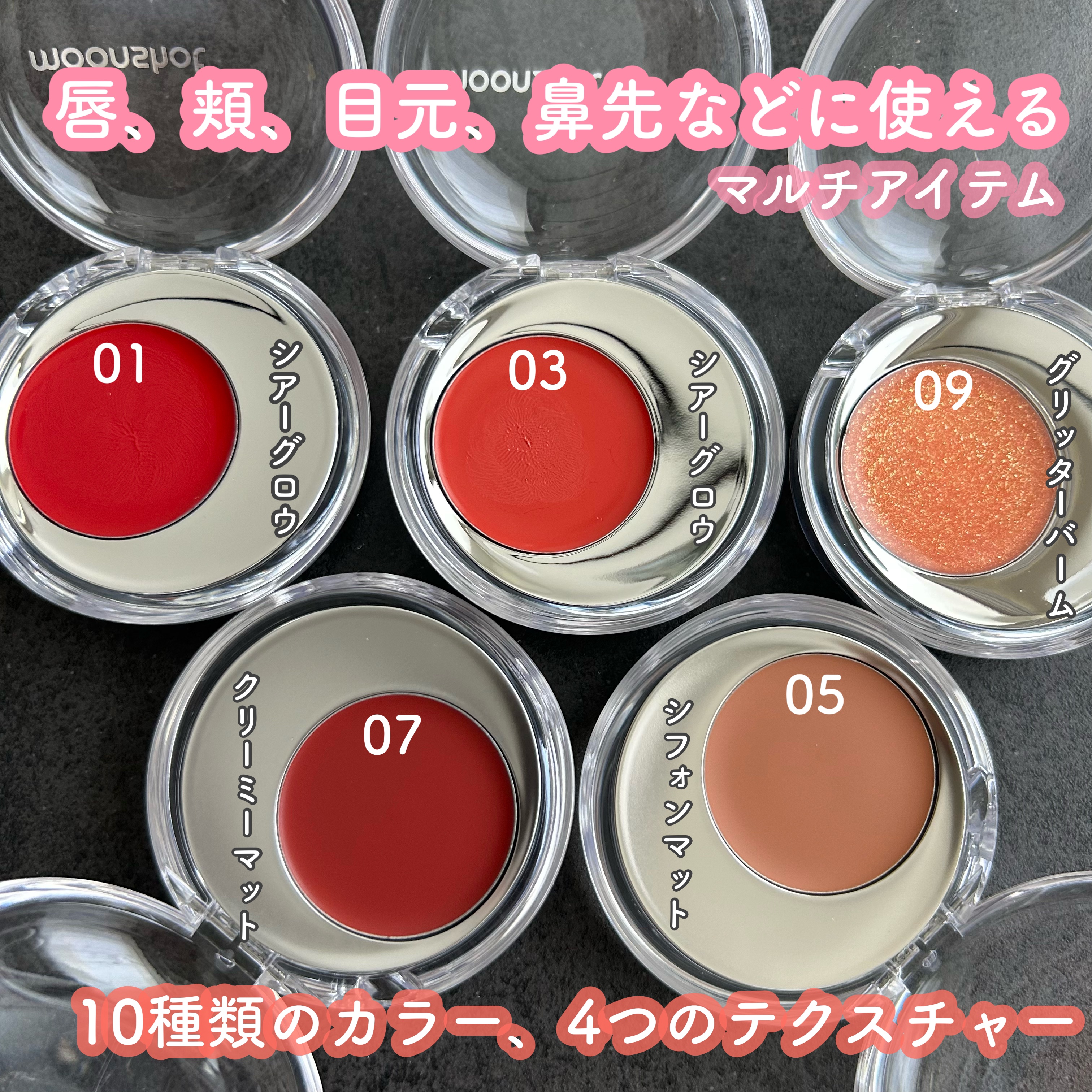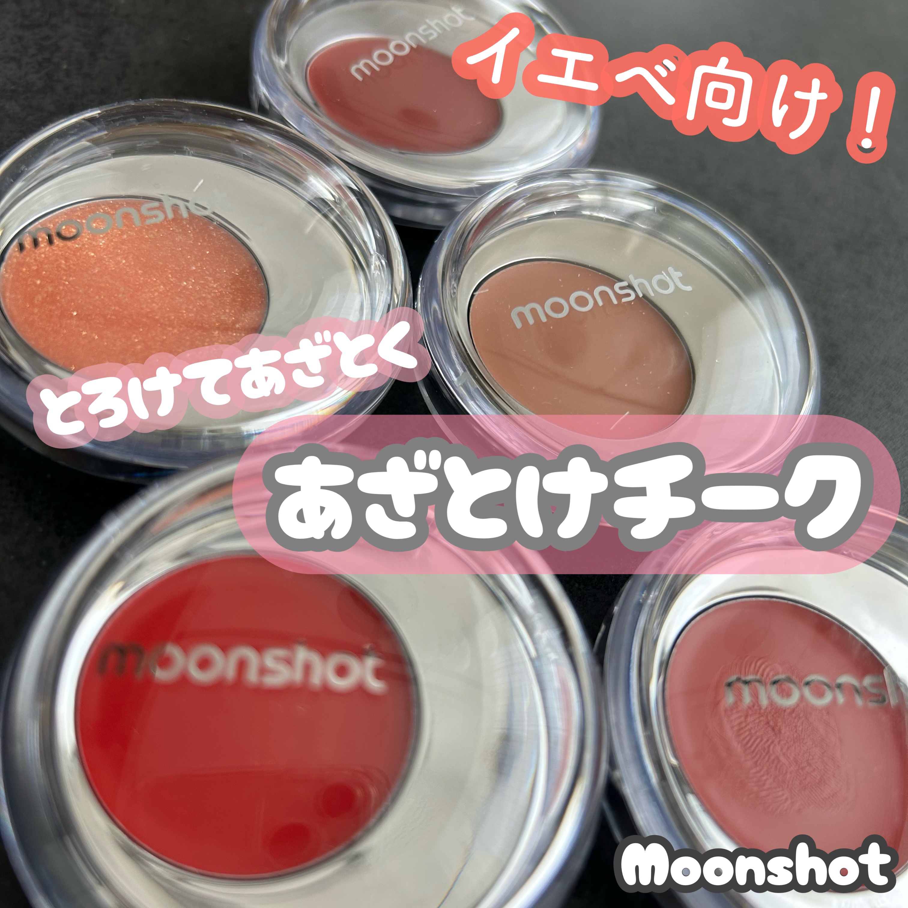 \とろけてあざとく、あざとけチーク/Moonshot01アルーイング03ジョイフル05ハンブル07クラッシー09ダズリングイエベ向けカラー5色を試してみたよ🫶01.03はとろんとしたバーム状で伸びがいい。塗りやすくツヤツヤな仕上がり。05.0...