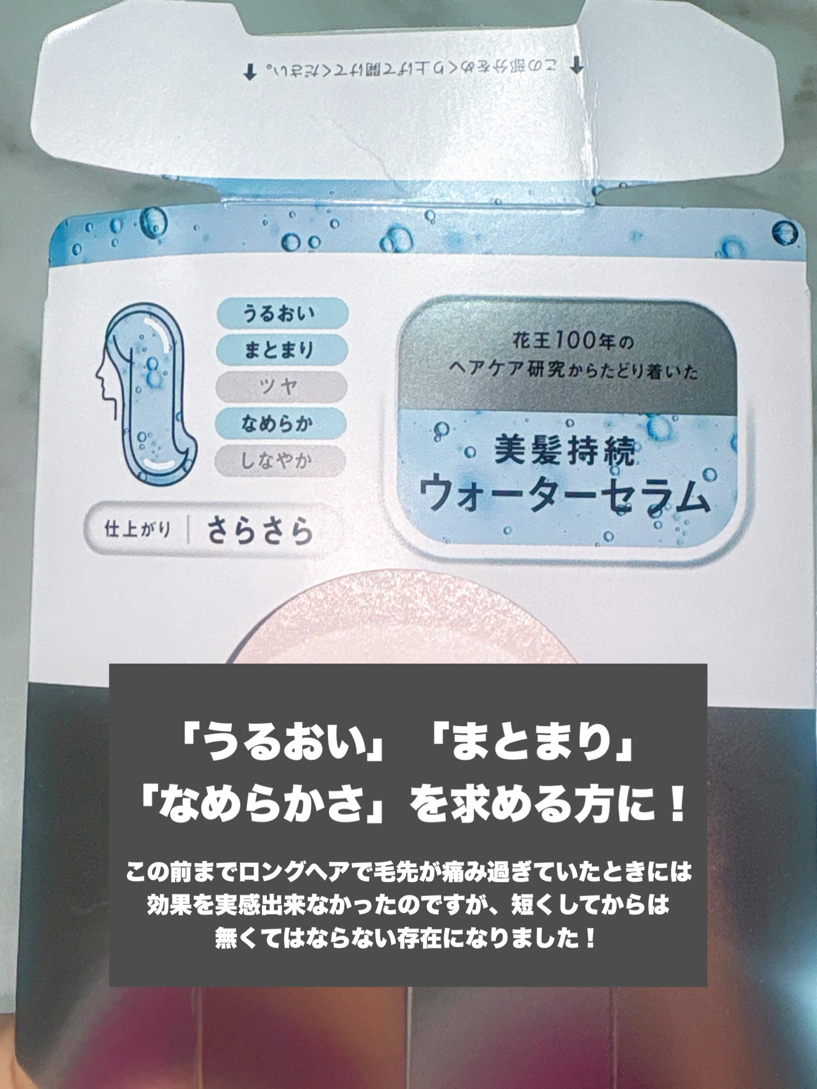 - 花王100年のヘアケア研究からたどり着いたヘアウォーターセラム うるおい、まとまり、なめらかな美しい髪へ導き、持続させる ●根元・毛先、部位ごとにダメージ状態が異なる毛髪に対して、長時間持続する均一な被膜を形成する「持続型ケア被膜技術」採用。毛先だけではなく、髪全体をケア ●美髪必須ヴェール成分w*¹(補修)、髪の美容液成分w*²(保湿)配合 ●熱・摩擦によるダメージを防ぐ ●熱・乾燥・高湿度等の外部刺激から髪を守る ●ベタつきにくい処方設計 ●朝のスタイリング時にも使える ●仕上がり さらさら ●凛として洗練されたベルガモット&ダフネの香り *¹ ポリシリコーン-29、加水分解ケラチン(羊毛)、セラミドα(ビスメトキシプロピルアミドイソドコサン)、リンゴ酸 *² γ-ドコサラクトン、加水分解コンキオリンタンパク、加水分解コラーゲン、加水分解シルク、加水分解ヒアルロン酸、ポリシリコーン-9