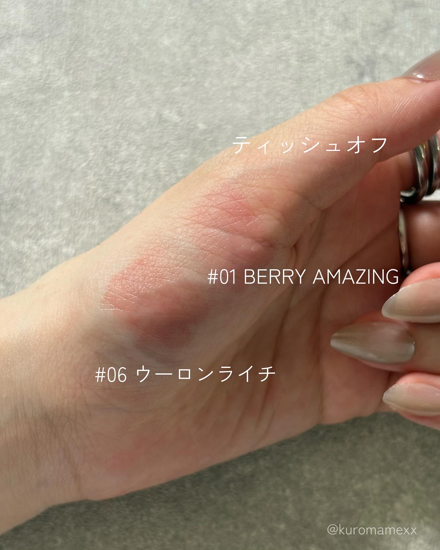 - <01 ベリーアメイジング> 水、デカイソステアリン酸ポリグリセリル-10、ビスジグリセリルポリアシルアジペート-2、ジフェニルジメチコン、フェニルトリメチコン、リンゴ酸ジイソステアリル、水添ポリイソブテン、ジグリセリン、ポリソルベート60、BG、セチルPEG/PPG-10/1ジメチコン、1,2-ヘキサンジオール、ペンチレングリコール、セテアレス-20、(アクリル酸ヒドロキシエチル/アクリロイルジメチルタウリンNa)コポリマー、スクワラン、フェノキシエタノール、エチルヘキシルグリセリン、香料、黄5、酸化チタン、イソステアリン酸ソルビタン、赤104(1)、赤227、水酸化Al、ポリアクリル酸アンモニウム、トコフェロール <02 アプリコットデュー> 水、デカイソステアリン酸ポリグリセリル-10、ビスジグリセリルポリアシルアジペート-2、ジフェニルジメチコン、フェニルトリメチコン、リンゴ酸ジイソステアリル、水添ポリイソブテン、ジグリセリン、ポリソルベート60、BG、セチルPEG/PPG-10/1ジメチコン、1,2-ヘキサンジオール、ペンチレングリコール、セテアレス-20、(アクリル酸ヒドロキシエチル/アクリロイルジメチルタウリンNa)コポリマー、スクワラン、フェノキシエタノール、酸化チタン、エチルヘキシルグリセリン、香料、黄4、黄5、イソステアリン酸ソルビタン、赤227、赤104(1)、水酸化Al、ポリアクリル酸アンモニウム、青1、トコフェロール <03 メリーピーチ> 水、デカイソステアリン酸ポリグリセリル-10、ビスジグリセリルポリアシルアジペート-2、ジフェニルジメチコン、フェニルトリメチコン、リンゴ酸ジイソステアリル、水添ポリイソブテン、ジグリセリン、ポリソルベート60、BG、セチルPEG/PPG-10/1ジメチコン、1,2-ヘキサンジオール、ペンチレングリコール、セテアレス-20、(アクリル酸ヒドロキシエチル/アクリロイルジメチルタウリンNa)コポリマー、スクワラン、フェノキシエタノール、酸化チタン、エチルヘキシルグリセリン、香料、黄4、赤227、イソステアリン酸ソルビタン、黄5、赤104(1)、水酸化Al、ポリアクリル酸アンモニウム、青1、トコフェロール <04 プラウドグレープ> 水、デカイソステアリン酸ポリグリセリル-10、ビスジグリセリルポリアシルアジペート-2、ジフェニルジメチコン、フェニルトリメチコン、リンゴ酸ジイソステアリル、水添ポリイソブテン、ジグリセリン、ポリソルベート60、BG、セチルPEG/PPG-10/1ジメチコン、1,2-ヘキサンジオール、ペンチレングリコール、セテアレス-20、(アクリル酸ヒドロキシエチル/アクリロイルジメチルタウリンNa)コポリマー、スクワラン、フェノキシエタノール、エチルヘキシルグリセリン、酸化チタン、香料、赤104(1)、黄4、イソステアリン酸ソルビタン、赤227、水酸化Al、ポリアクリル酸アンモニウム、青1、トコフェロール <05 レベルアップベリー> 水、デカイソステアリン酸ポリグリセリル-10、ビスジグリセリルポリアシルアジペート-2、ジフェニルジメチコン、フェニルトリメチコン、リンゴ酸ジイソステアリル、水添ポリイソブテン、ジグリセリン、ポリソルベート60、BG、セチルPEG/PPG-10/1ジメチコン、1,2-ヘキサンジオール、ペンチレングリコール、セテアレス-20、(アクリル酸ヒドロキシエチル/アクリロイルジメチルタウリンNa)コポリマー、スクワラン、フェノキシエタノール、エチルヘキシルグリセリン、香料、黄5、赤227、イソステアリン酸ソルビタン、青1、トコフェロール <06 ウーロンライチ> 水、デカイソステアリン酸ポリグリセリル-10、ビスジグリセリルポリアシルアジペート-2、ジフェニルジメチコン、フェニルトリメチコン、リンゴ酸ジイソステアリル、水添ポリイソブテン、ジグリセリン、ポリソルベート60、BG、セチルPEG/PPG-10/1ジメチコン、1,2-ヘキサンジオール、ペンチレングリコール、セテアレス-20、(アクリル酸ヒドロキシエチル/アクリロイルジメチルタウリンNa)コポリマー、スクワラン、フェノキシエタノール、酸化チタン、エチルヘキシルグリセリン、赤227、黄4、香料、イソステアリン酸ソルビタン、水酸化Al、ポリアクリル酸アンモニウム、青1、トコフェロール <07 プロップフィグ> 水、デカイソステアリン酸ポリグリセリル-10、ビスジグリセリルポリアシルアジペート-2、ジフェニルジメチコン、フェニルトリメチコン、リンゴ酸ジイソステアリル、水添ポリイソブテン、ジグリセリン、ポリソルベート60、BG、セチルPEG/PPG-10/1ジメチコン、1,2-ヘキサンジオール、ペンチレングリコール、セテアレス-20、(アクリル酸ヒドロキシエチル/アクリロイルジメチルタウリンNa)コポリマー、スクワラン、フェノキシエタノール、エチルヘキシルグリセリン、黄5、赤227、香料、イソステアリン酸ソルビタン、青1、トコフェロール <08 ジョイフルパーシモン> 水、デカイソステアリン酸ポリグリセリル-10、ビスジグリセリルポリアシルアジペート-2、ジフェニルジメチコン、フェニルトリメチコン、リンゴ酸ジイソステアリル、水添ポリイソブテン、ジグリセ