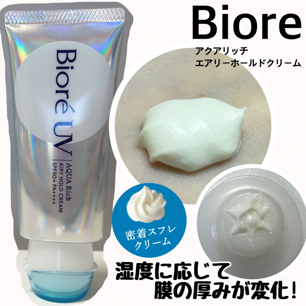 【ビオレアクアリッチエアリーホールドクリーム】マツキヨココカラ限定の呼吸感ベールUV。ホイップクリームなテクスチャーで使用感が気になりすぎた。ふわじゅわな使い心地で密着感高め。サラッとしてて快適だけど、顔に使うとちょっと乾燥が気になるかも……...