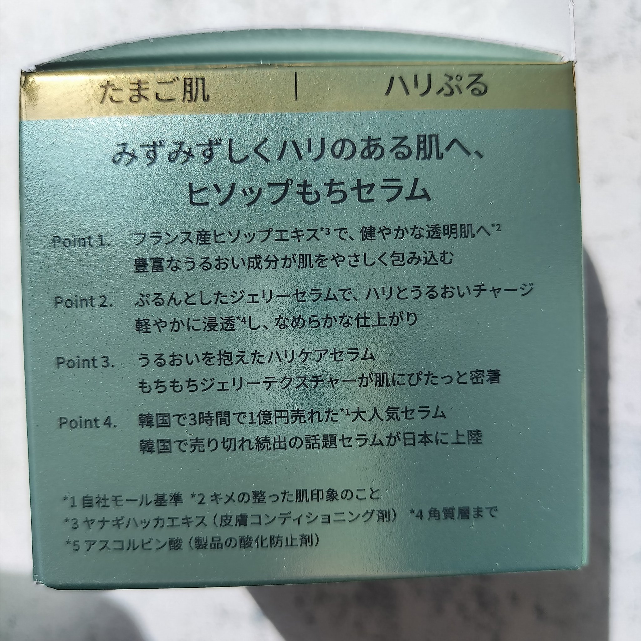 - <ホーリーヒソップ もちセラム> 水、ブチレングリコール、グリセリン、プロパンジオール、1,2-ヘキサンジオール、ナイアシンアミド、ペンチレングリコール、カルボマー、メチルプロパンジオール、ヒアルロン酸ナトリウム、加水分解ヒアルロン酸、ポリグリセリル-10ラウレート、トロメタミン、デシルグルコシド、ヒソプスオフィシナルリス抽出物、アデノシン、マルトデキストリン、ポリグルタミン酸、EDTA二ナトリウム、ダマスクバラ花エキス、クラタエグス果実エキス、リンゴ果実エキス、カプリルグリコール、加水分解ガーデニアフロリダ抽出物、梨エキス、キノコ抽出物、ステアリン酸ポリグリセリル-10、セラミドNP、アスコルビン酸、パルミトイルペンタペプチド-4