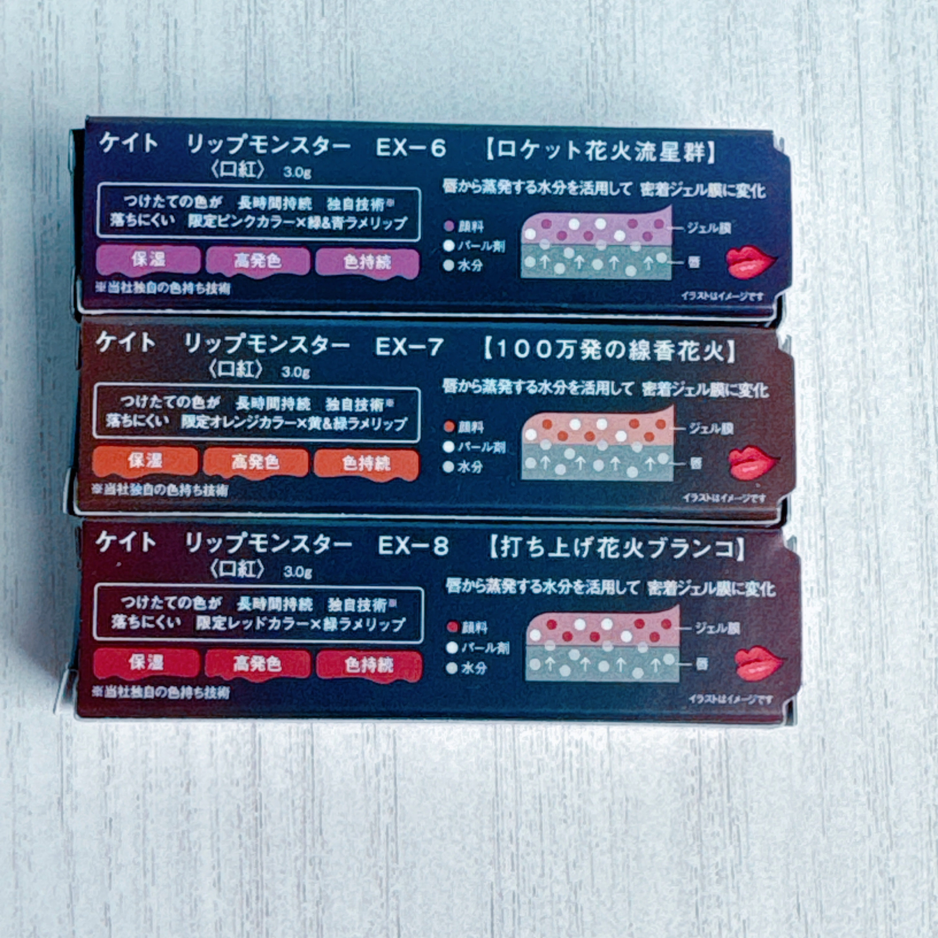\👾モンスター界を彩る不思議な花火👾/#KATE☑︎#リップモンスターEX-6ロケット花火流星群↪︎ピンクカラー×緑&青ラメEX-7100万発の線香花火↪︎オレンジカラー×緑&黄ラメEX-8打ち上げ花火ブランコ↪︎レッドカラー×緑ラメ先行...