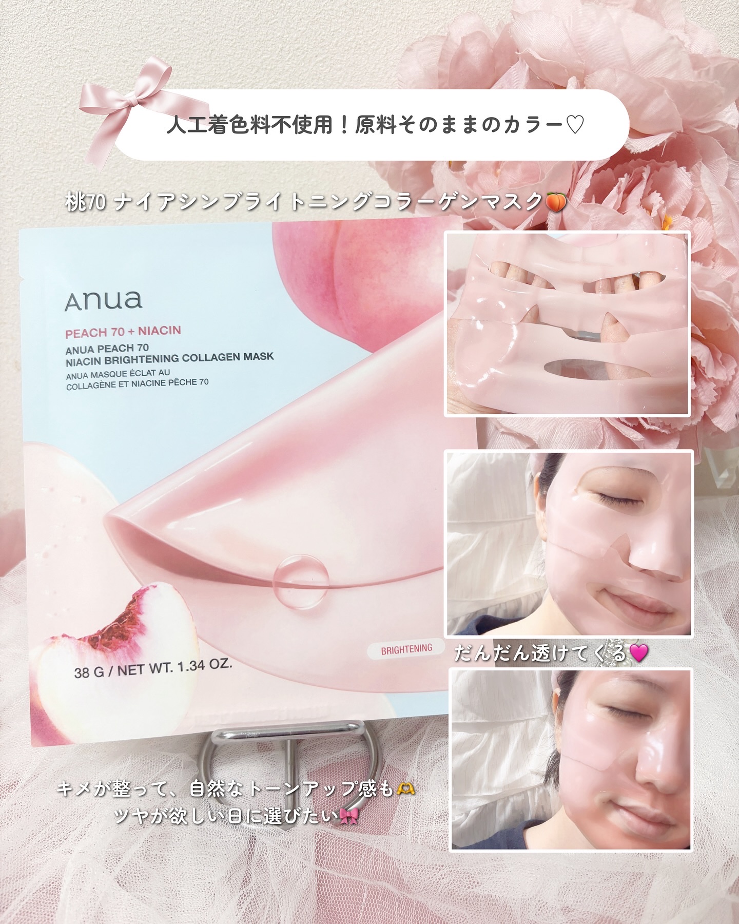\\Anua//桃70ナイアシンブライトニングコラーゲンマスクコラーゲンマスク1枚で美肌&水分うるおい弾力ケア✨肌に必要な成分をたっぷり詰め込んだコラーゲンぷるぷるうるおいゲル✨優しい使い心地で、完全に透明になるまで使わなくても30分くらいで...