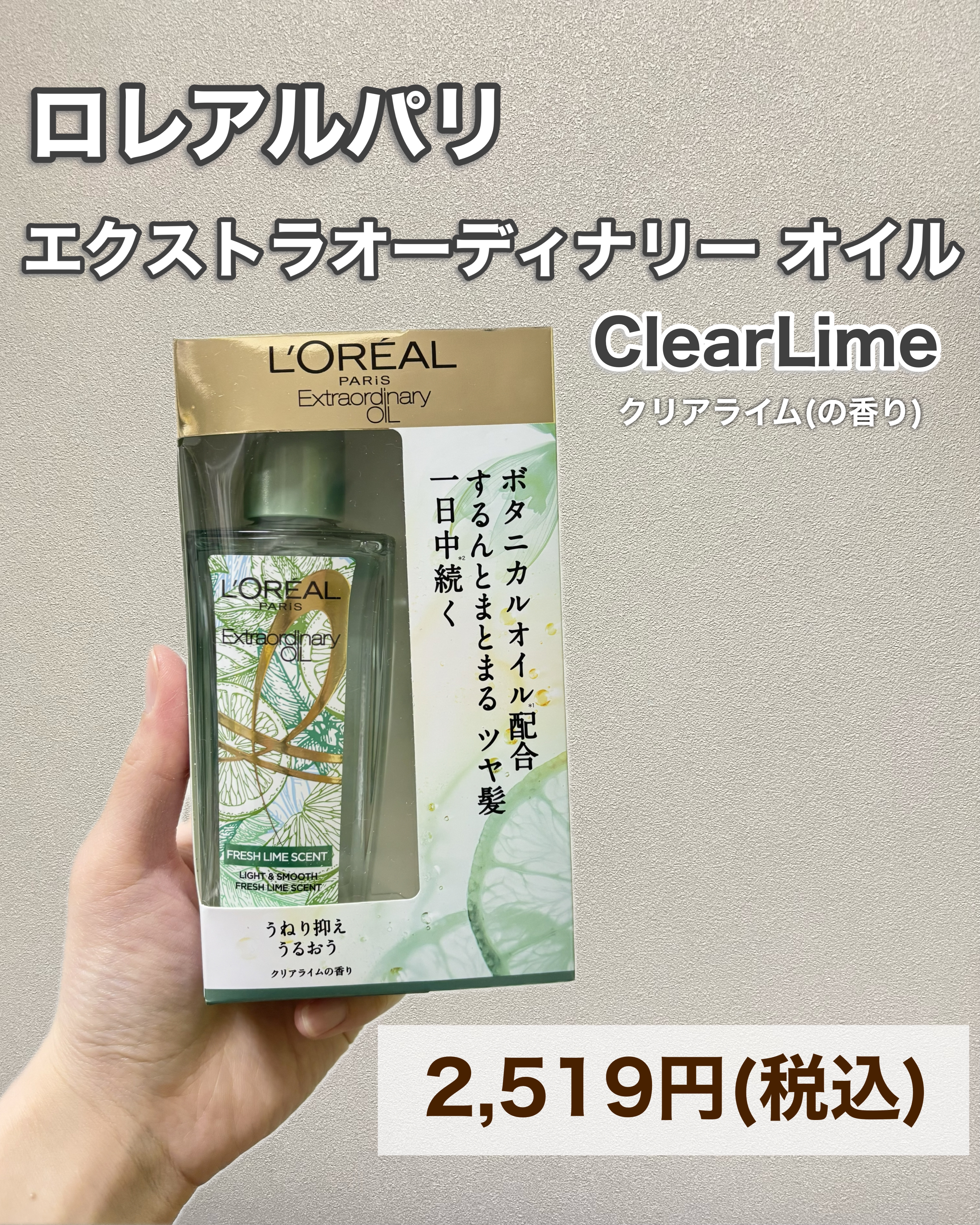 - #深呼吸したくなるヘアオイル ライムで、惹きつける。 髪そよぐたび、透きとおるツヤ感 ①大人気フレグランス、待望の定番化! かつて限定発売で大好評を博した爽やかなライムの香りが、多くのお客様からの熱いご要望にお応えして、ついに定番化。 ②みずみずしいライム&ミントの香り 付けた瞬間ふんわり香るライムとミントで、ヘアケアタイムを心地よく。 動くたびに、爽やかな香りが広がります。 ③ボタニカルオイル*¹配合、一日中²続く、さらツヤ髪へ パサつく髪1本1本を保護し、軽やかなうるおいが持続。 1日中*²サラサラ続くツヤ髪に。 *1 セイヨウハッカ油、レモン果皮油(全て保湿成分) *2 当社調べ。個人差があります。 2025年03月29日、定番化に伴い商品名が「ロレアル パリ エルセーヴ エクストラオーディナリー オイル フレッシュライムの香り」から「ロレアル パリ エクストラオーディナリー クリアライム」へ変更しました。