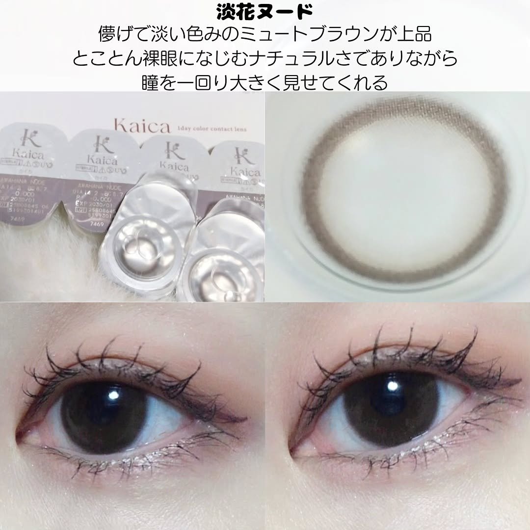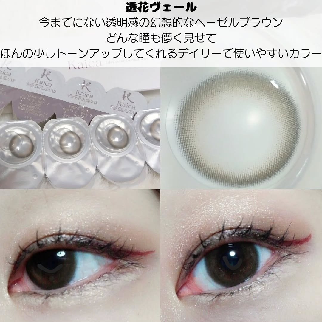 - 『Kaica』のレンズは全て「人口っぽさ」をできるだけなくし、間近で見てもカラコンをしていることがバレにくいデザイン設計。 まるでオーロラのように美しい彩りのヴェールを瞳にまとったかのような仕上がりになるのが特徴です。 裸眼の色に左右されることなく、黒目さんでも茶目さんでも、色が浮くことなくキレイに色が溶け込むように馴染むため、裸眼を活かしながら透明感を瞳に与えることができます。 2025年4月発売 <月絃ベージュ> 今っぽトレンドのトーンアップベージュ。愛らしさをプラスしてくれる、ちゅるん系レンズ <咲初ショコラ> 瞳をきらっと魅せる王道ダークブラウン。どんなシーンでも迷わず使える、実力派レンズ。 <淡花ヌード> 儚げでミュートな淡色ブラウン。とことん裸眼に馴染む、ナチュラルを追及したレンズ。 <透花ヴェール> こだわりの透明感を叶える幻想的なヘーゼルブラウン。どんな瞳も儚く魅せる、色素薄い系レンズ。 <優花ブラウン> 瞳のトーンアップを演出する柔らかいライトブラウン。自然に瞳を印象づける、サークルレンズ。 <優月ブラック> 瞳に透明感を与える優しげなブラック。自然に瞳を印象づける、サークルレンズ。 カラーコンタクトレンズの不適正使用による眼障害の危険性等などがあります。 ●コンタクトレンズは高度管理医療機器です。不十分な洗浄・消毒など不適切なケアや、長時間・交換期間を超えた装用により、アレルギー性結膜炎、角膜感染症、角膜潰瘍等の重篤な眼障害が発生する危険性があります ●ご使用前に取扱説明書を確認してください 使用上の留意事項 ●眼科医院等を受診してからお求めください ●眼に異常を感じたら直ちにレンズ使用を中止し、お近くの眼科等で診察を受けてください ●医師の指示にしたがってご使用ください ●コンタクトレンズを装用する場合、自覚症状がなくても、眼科医院等での定期検査を受けてください ●レンズに不具合がある場合は使用しないでください