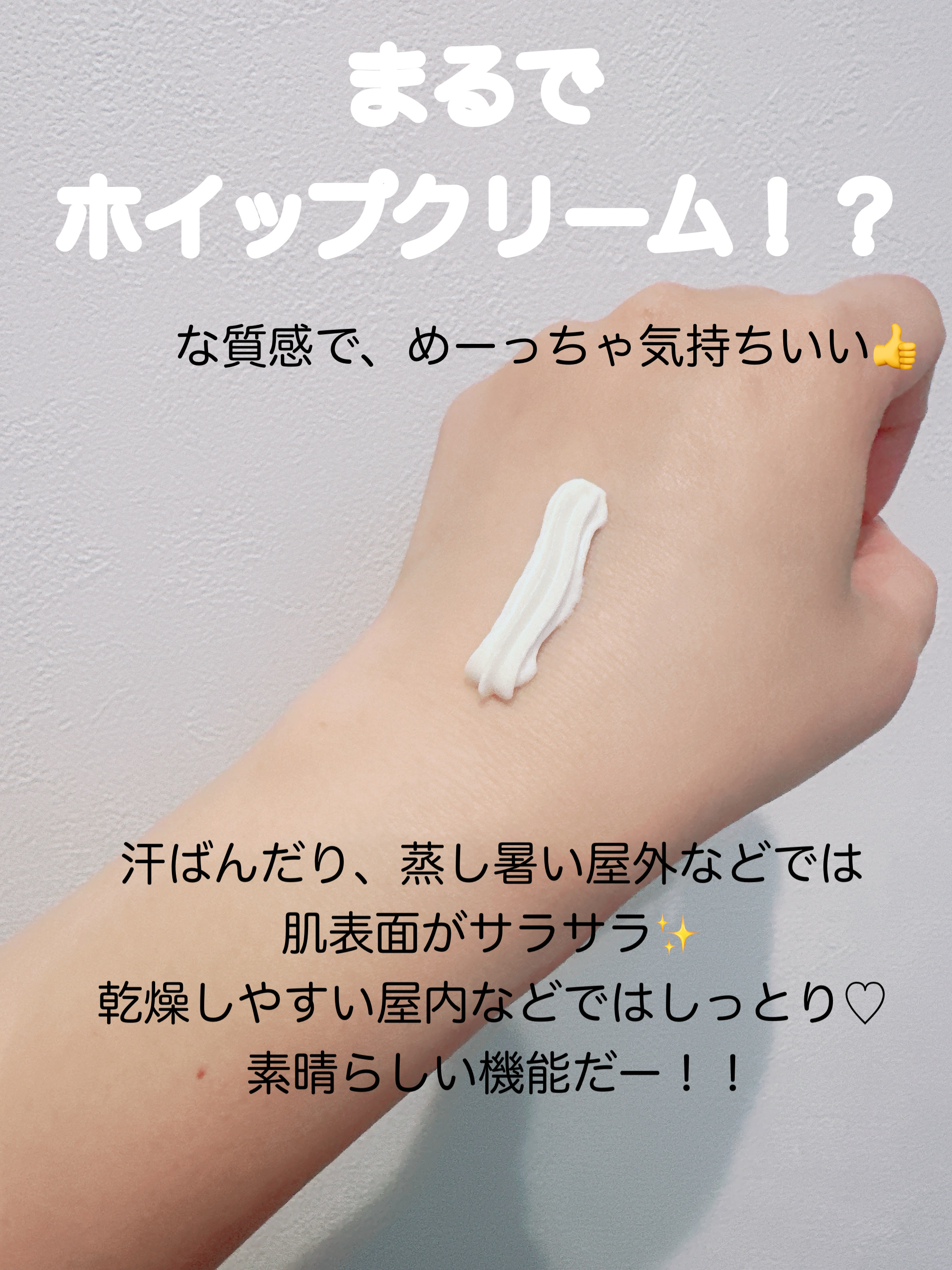 思わずたっぷり塗りたくなる 次世代の日やけ止めが新登場❣️ ベタつかない秘密はホイップクリームのような新感覚なテクスチャー! 湿度環境の変化によって膜の厚みが変化⚡️ 汗ばむ時や蒸し暑い外では、汗を吸って肌表面がサラっとしているのに、ドライな室内では乾燥を防ぐなんて夢のような日やけ止めだよね⁉️😳