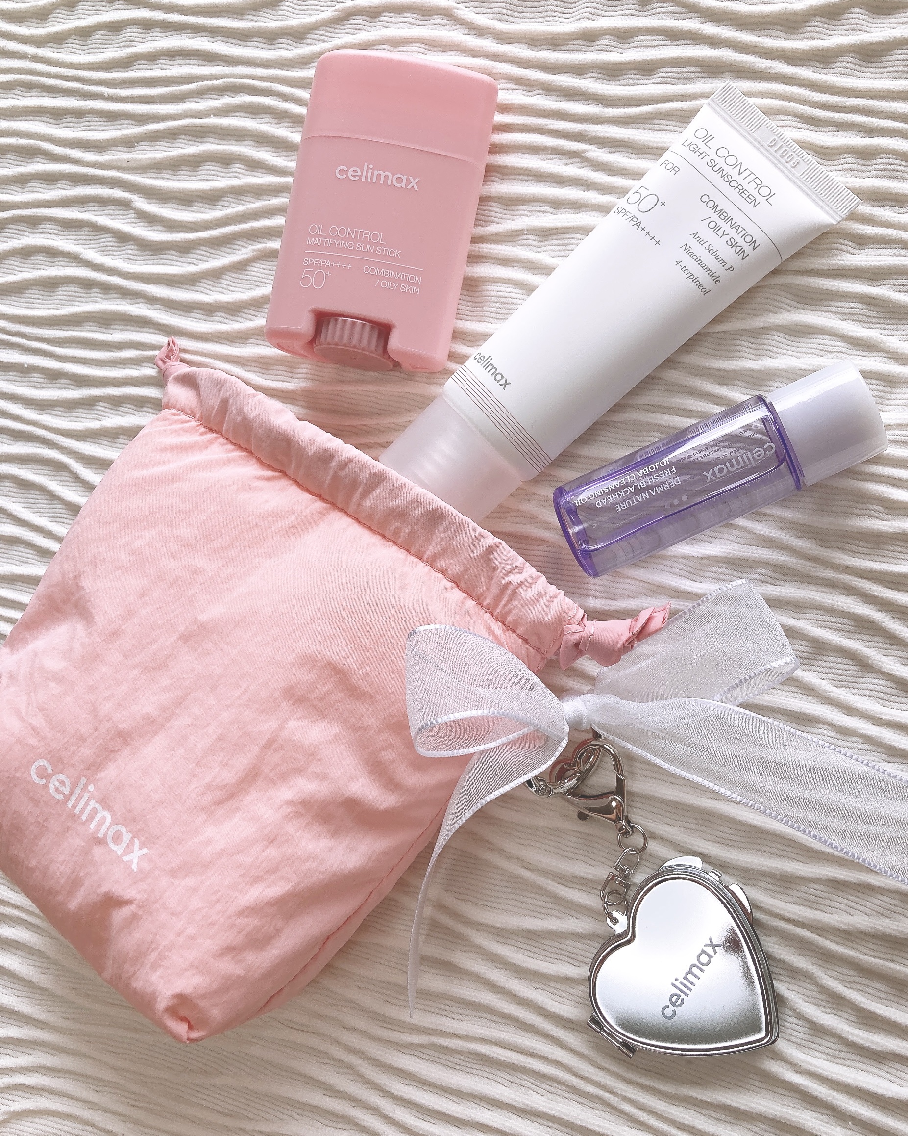celimaxのアイテムで持ち歩き用のオイルコントロールキットを作ろう!・オイルコントロール日焼け止めスティック・オイルコントロール日焼け止め・フレッシュクレンジングオイル(ミニサイズ)・ハートミラーキーホルダー・ミニポーチオイルコントロール...