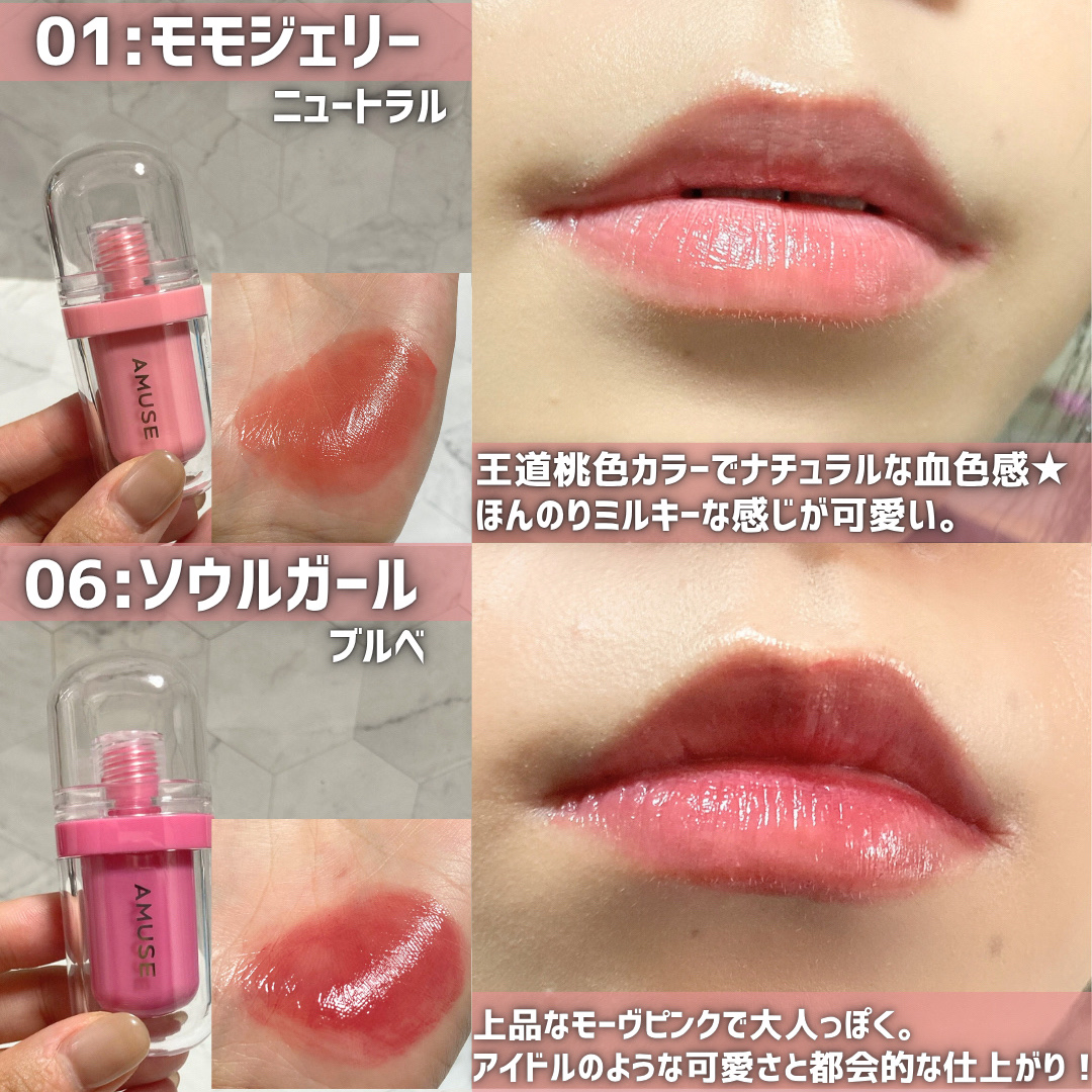 - 濃密なぷにゅっとジェリーが もっちり密着される 長時間持続のジェルフィットティント ☑ぷにゅっとジェリーがもっちり密着される長時間持続&新概念ジェルフィットテクスチャー* ☑8Shadesの透き通るぷにゅっとジェリー発色 ☑3重ツヤシステムで満たせれたぷにゅっとしたジェリーツヤ ☑ジェリーツヤ膜で保湿感ロック ☑手軽いサイズのNEW透明ティント&ぷにゅぷにゅジェリーデザイン ☑ヴィーガン処方 *)AMUSE内において