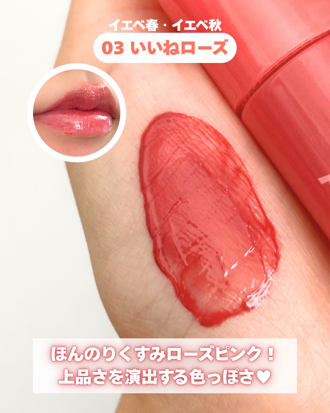 - <01 BEST BEIGE MENU(推し杏子ベージュ)> 水、ジフェニルジメチコン、リンゴ酸ジイソステアリル、ビスジグリセリルボリアシルアジペート-2、水添ポリイソブテン、ダイマー ジリノール酸ダイマージリノレイルビス(ベヘニル/イソステアリル/フィトステリル)、ジグリセリン、セチルPEG/PPG-10/1ジメチコン、DPG、水添ポリ (C6-14 オレフィン)、ポリソルベート60、イソステアリン酸ソルビタン、ダイマージリノール酸ジイソステアリン酸ポリ グリセリル-3、ペンチレングリコール、(アクリル酸ヒドロキシエチル/アクリロイルジメチルタウリンNa)コポリマー、トリ(カプリル酸/ カプリン酸)グリセリル、スクワラン、セテアレス-20、(エチレン/プロピレン)コポリマー、フェノキシエタノール、グリセリン、ポリグリ セリン-3、香料、エチルヘキシルグリセリン、ハマメリス葉エキス、オニユリエキス、BG、酸化チタン、黄5、赤227、赤104(1)、青1 <02 CORAL INFLUENCER(イエベ必須コーラル)> 水、ジフェニルジメチコン、リンゴ酸ジイソステアリル、ビスジグリセリルボリアシルアジペート-2、水添ポリイソブテン、ダイマー ジリノール酸ダイマージリノレイルビス(ベヘニル/イソステアリル/フィトステリル)、ジグリセリン、セチルPEG/PPG-10/1ジメチコン、DPG、水添ポリ (C6-14 オレフィン)、ポリソルベート60、イソステアリン酸ソルビタン、ダイマージリノール酸ジイソステアリン酸ポリ グリセリル-3、ペンチレングリコール、(アクリル酸ヒドロキシエチル/アクリロイルジメチルタウリンNa)コポリマー、トリ(カプリル酸/ カプリン酸)グリセリル、スクワラン、セテアレス-20、(エチレン/プロピレン)コポリマー、フェノキシエタノール、グリセリン、ポリグリ セリン-3、香料、エチルヘキシルグリセリン、ハマメリス葉エキス、オニユリエキス、BG、酸化チタン、黄5、赤227、赤104(1)、青1 <03 ROSE IN MIND(いいねローズ)> 水、ジフェニルジメチコン、リンゴ酸ジイソステアリル、ビスジグリセリルポリアシルアジペート-2、水添ポリイソブテン、ダイマージリノール酸ダイマージリノレイルビス(ベヘニル/イソステアリル/フィトステリル)、ジグリセリン、DPG、セチルPEG/PPG-10/1ジメチコン、水添ポリデセン、ポリソルベート60、イソステアリン酸ソルビタン、ダイマージリノール酸ジイソステアリン酸ポリグリセリル-3、ペンチレングリコール、(アクリル酸ヒドロキシエチル/アクリロイルジメチルタウリンNa)コポリマー、トリ(カプリル酸/カプリン酸)グリセリル、スクワラン、セテアレス-20、(エチレン/プロピレン)コポリマー、フェノキシエタノール、グリセリン、香料、エチルヘキシルグリセリン、ハマメリス葉エキス、オニユリエキス、BG、テトラ(ジ-t-ブチルヒドロキシヒドロケイヒ酸)ペンタエリスリチル、酸化チタン、黄5、赤104(1)、赤227、青1 <04 PINK YOUTH(ベイビー天使)> 水、ジフェニルジメチコン、リンゴ酸ジイソステアリル、ビスジグリセリルボリアシルアジペート-2、水添ポリイソブテン、ダイマー ジリノール酸ダイマージリノレイルビス(ベヘニル/イソステアリル/フィトステリル)、ジグリセリン、セチルPEG/PPG-10/1ジメチコン、DPG、水添ポリ (C6-14オレフィン)、ポリソルベート60、イソステアリン酸ソルビタン、ダイマージリノール酸ジイソステアリン酸ポリ グリセリル-3、ペンチレングリコール、(アクリル酸ヒドロキシエチル/アクリロイルジメチルタウリンNa)コポリマー、トリ(カプリル酸/ カプリン酸)グリセリル、スクワラン、セテアレス-20、(エチレン/プロピレン)コポリマー、フェノキシエタノール、ポリグリセリン-3、香料、エチルヘキシルグリセリン、グリセリン、水酸化Al、ポリアクリル酸アンモニウム、BG、ハマメリス葉エキス、オニユリエキス、酸化チタン、赤227、黄4、赤104 (1) 黄5、青1 <05 CHERRY SO WHAT(どうしたのチェリー)> 水、ジフェニルジメチコン、リンゴ酸ジイソステアリル、ビスジグリセリルポリアシルアジペート-2、水添ポリイソブテン、ダイマージリノール酸ダイマージリノレイルビス(ベヘニル/イソステアリル/フィトステリル)、ジグリセリン、セチルPEG/PPG-10/1ジメチコン、DPG、水添ポリ(C6-14オレフィン)、ポリソルベート60、イソステアリン酸ソルビタン、ダイマージリノール酸ジイソステアリン酸ポリグリセリル-3、ペンチレングリコール、(アクリル酸ヒドロキシエチル/アクリロイルジメチルタウリンNa)コポリマー、トリ(カプリル酸/カプリン酸)グリセリル、スクワラン、セテアレス-20、(エチレン/プロピレン)コポリマー、フェノキシエタノール、ポリグリセリン-3、香料、エチルヘキシルグリセリン、グリセリン、ハマメリス葉エキス、オニユリエキス、BG、赤227、黄4、赤104(1)、黄5、青1 <06 PLUM UPDATE(プロフ写プラム)> 水、ジフェニルジメチコン、リンゴ酸ジイソステアリル、ビスジグリセリルポリアシルアジペート-2、水添ポリイソブテン、ダイマー ジリノール酸ダイマージリノレイルビス(ベヘニル/イソステアリル/フィトステリル)、