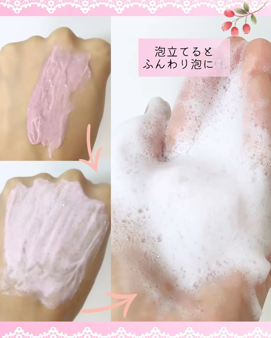 - <ロイヤルローズヒップ> グリセリン、水、ココイルイセチオン酸Na、ココイルグリシンNa、アーモンド、1,2-ヘキサンジオール、ヤシ脂肪酸、ココイルメチルタウリンNa、セルロース、コメ粉、イセチオン酸Na、リンゴ繊維、ステアリン酸グリセリル、ヒドロキシプロピルデンプンリン酸、プロパンジオール、塩化Na、キサンタンガム、香精、クチナシ果実エキス、カプリリルグリコール、デキストリン、エチルヘキシルグリセリン、EDTA-2Na、アロエベラ葉エキス、カニナバラ果実エキス、カミツレエキス、ココイルリンゴアミノ酸Na、ヘキシレングリコール、グルタミン酸ジ酢酸4Na