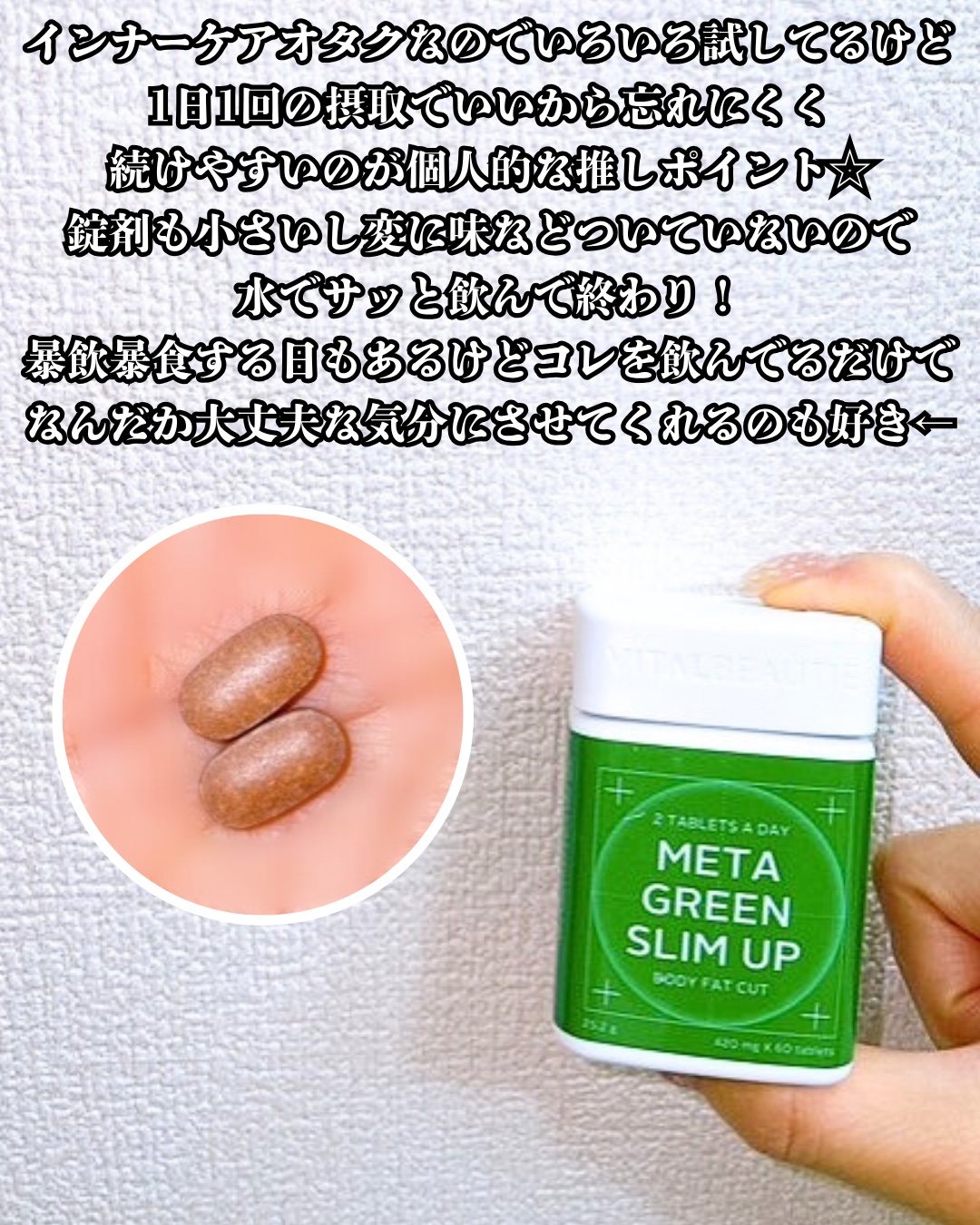 #PRメタグリーンスリムアップ🌿▶@vitalbeautie_official1日2粒💚食後必須アイテム✨緑茶カテキン配合で、食事後の脂肪の吸収を抑えて、排出を手伝ってくれる♡小粒だから飲みやすくて続けやすいのも◎✨#ダイエット#体脂肪減少#...