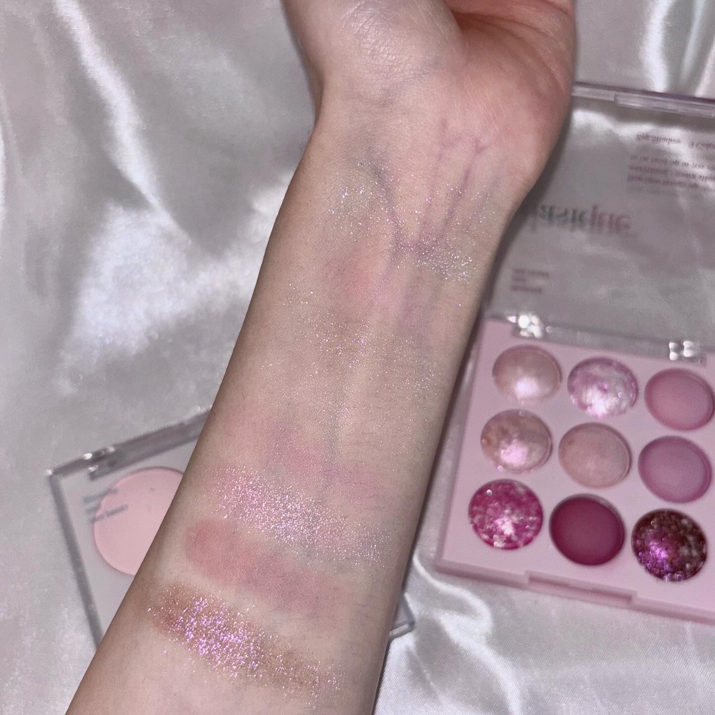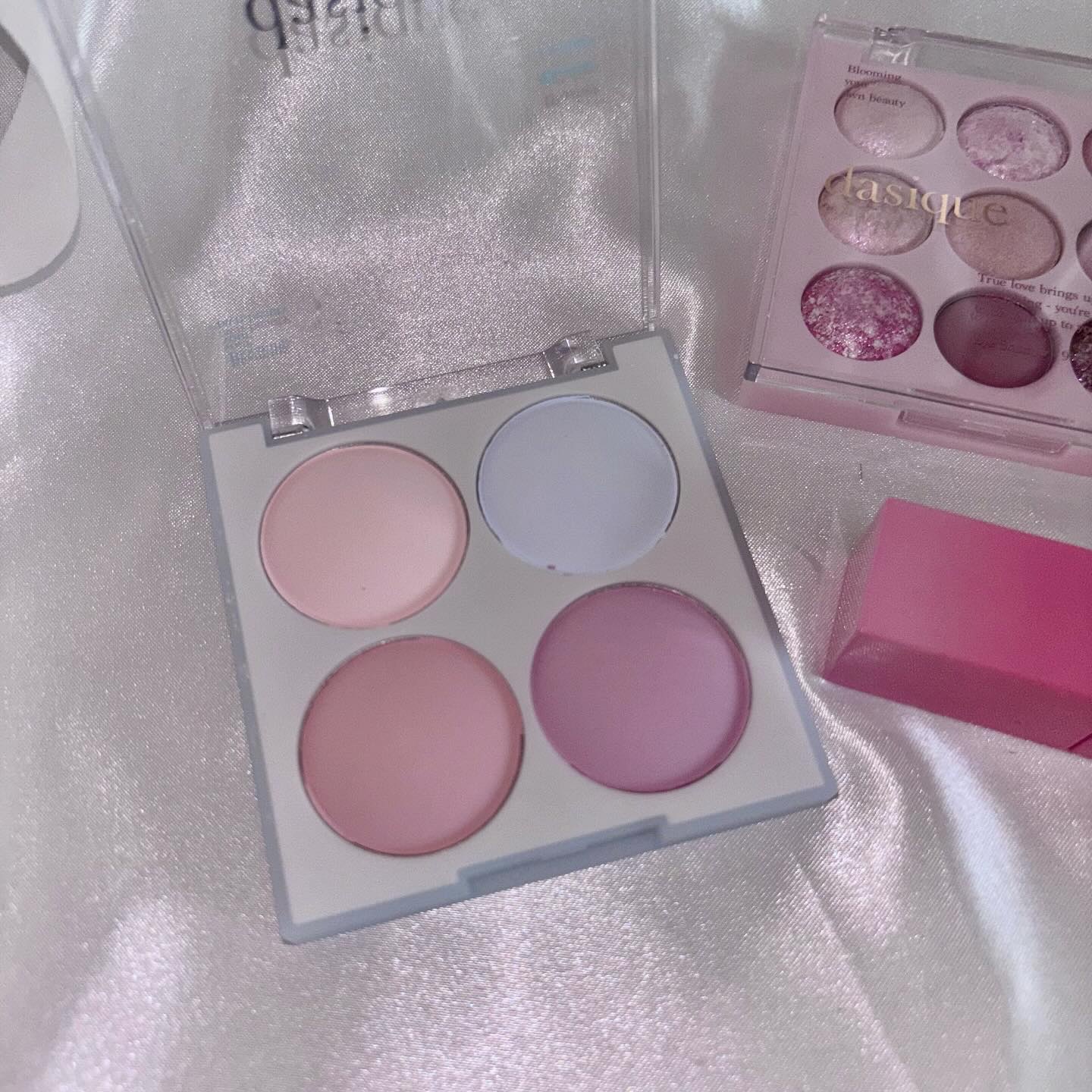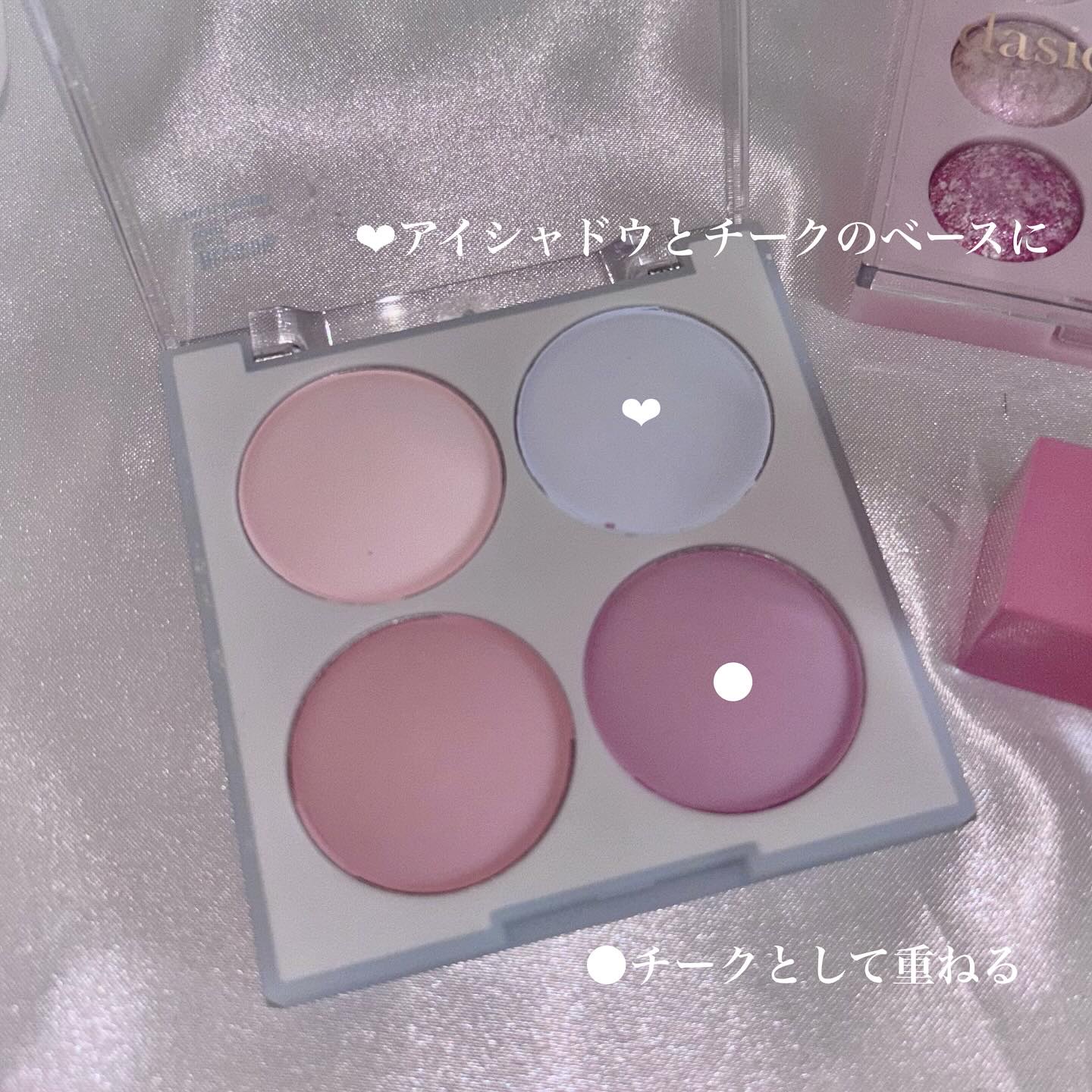 アイシャドウは可愛い配色なのはもちろんのこと、予想していたより発色が良くて驚きました!❤︎ 私は白みピンクが大好物であり得意なのでまぶたでも綺麗に発色してくれてドンピシャなカラー🥹🥹 ラメもそれぞれ個性があって素敵...😭🩷🩷 チークもまた予想以上に発色が良くて、驚きました😳 4色でグラデーションがしやすいし、ちゃんと見た目通りの発色なのでギャップを感じにくくて感動です... 可愛さだけじゃないところがさすがdasique🎀 おまけに付いていたグロスなどもめちゃくちゃ可愛くて、全部見ているだけで幸せになれそうです🥺