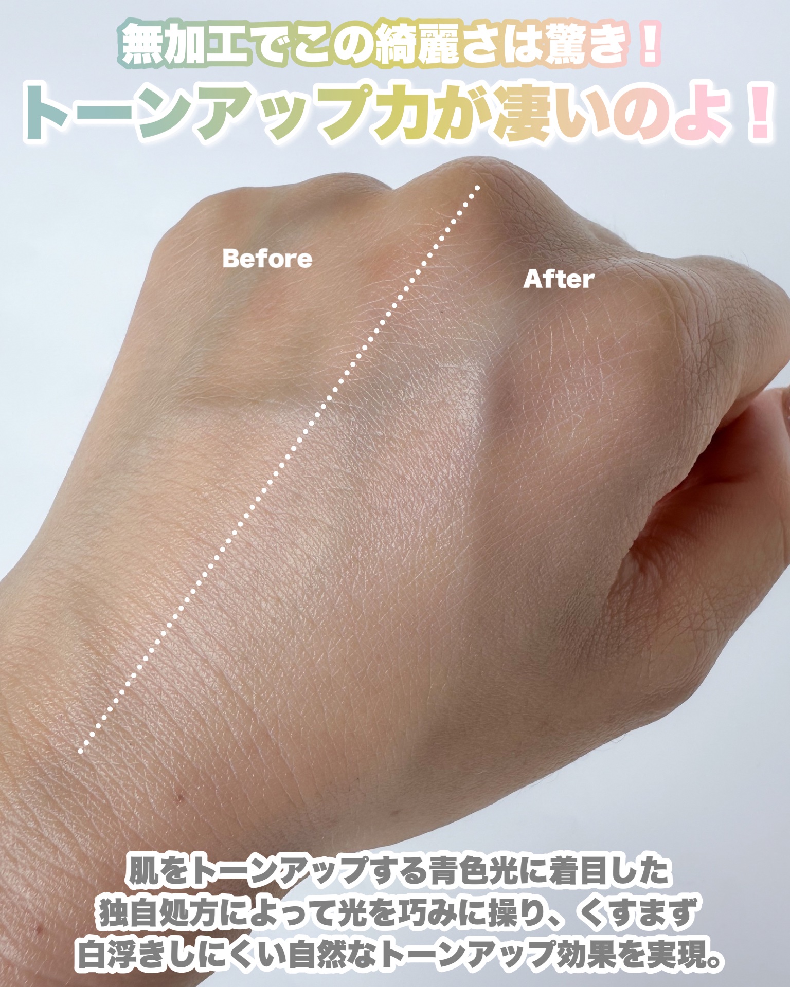 - SPF50+ PA++++ 「Deep紫外線」までしっかりカットしながら、透明感のあるトーンアップも叶えます。 今も、未来も、透明感ある明るい肌へ。 肌の奥まで侵入してシミの元となるDeep紫外線をしっかりカット。 さらに、Deep紫外線による新たなシミ発生ルートをブロックします。 笑っても、しゃべってもくずれにくいUV膜が、肌の動きにしなやかにフィットして、Deep紫外線をしっかりカット。 破れないから、紫外線カット力が続きます。 Deep紫外線をトーンアップ光(=青色光)に変換することで、くすまず白浮きしにくい自然なトーンアップ効果を実現します。 Deep紫外線を浴びるたび輝き、透明感のある明るい肌に整えます。 肌にピッタリと密着し、しっとりなめらかなつけ心地です。 べたつかず、心地よい保湿感で、一日中乾燥を防ぎます。 洗顔料で簡単オフ。 敏感肌の方でも使える、肌に優しい設計(パッチテスト済)。 紫外線に反応して色が変わるUVセ 紫外線に反応して色が変わるUVセンサーキャップ。 ンサーキャップ。