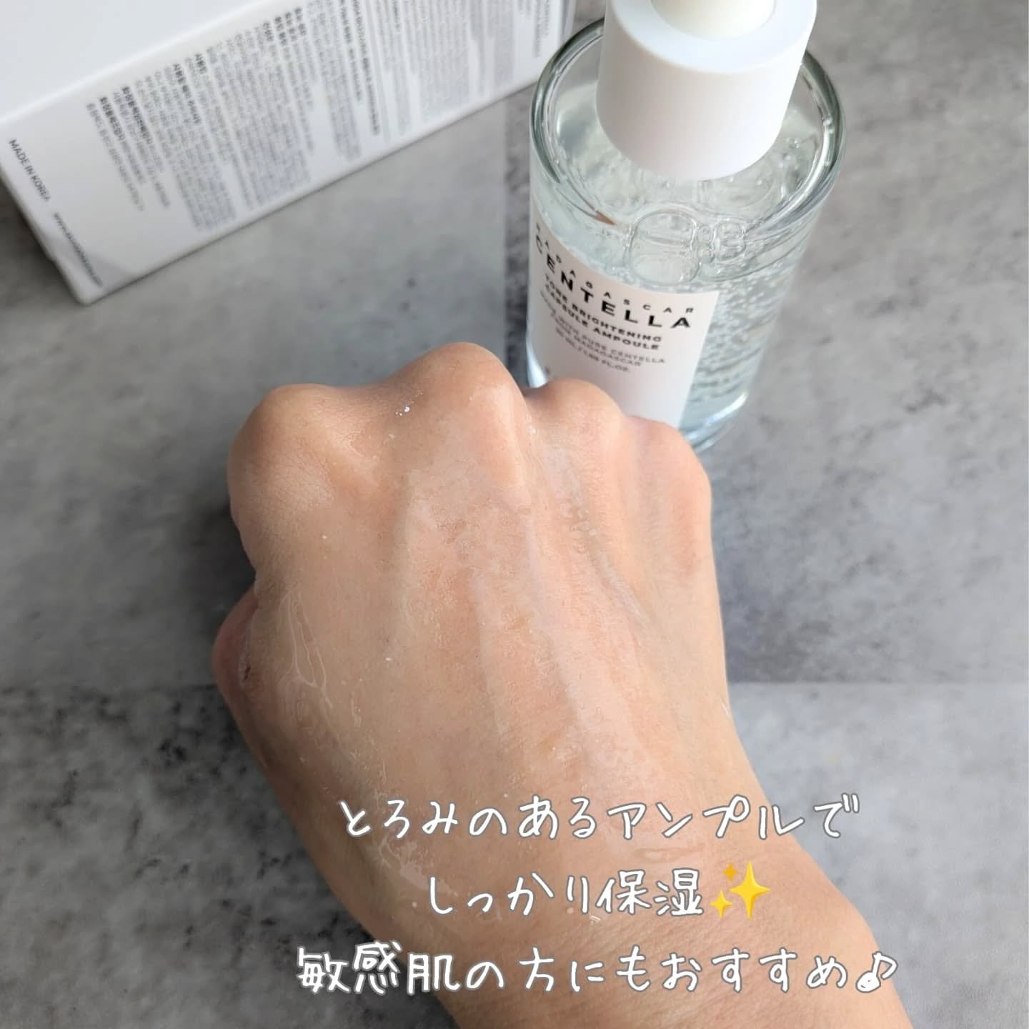 - <100ml> 水、ペンチレングリコール、BG、グリセリン、キサンタンガム、アルギニン、エチルヘキシルグリセリン、水添レシチン、ヒドロキシエチルセルロース、ベタイン、マンニトール、3-O-エチルアスコルビン酸、パンテノール、1,2-ヘキサンジオール、トラネキサム酸、(アクリレーツ/アクリル酸アルキル(C10-30))クロスポリマー、グルコース、ナイアシンアミド、結晶セルロース、コーンスターチ、マデカッソシド、キシリトール、乳酸桿菌発酵液、キシリチルグルコシド、無水キシリトール、ツボクサエキス(77%) <50ml> 水、ペンチレングリコール、BG、グリセリン、キサンタンガム、アルギニン、エチルヘキシルグリセリン、水添レシチン、ヒドロキシエチルセルロース、ベタイン、マンニトール、3-O-エチルアスコルビン酸、パンテノール、1,2-ヘキサンジオール、トラネキサム酸、(アクリレーツ/アクリル酸アルキル(C10-30))クロスポリマー、グルコース、ナイアシンアミド、結晶セルロース、コーンスターチ、マデカッソシド、キシリトール、乳酸桿菌発酵液、キシリチルグルコシド、無水キシリトール、ツボクサエキス(77%)