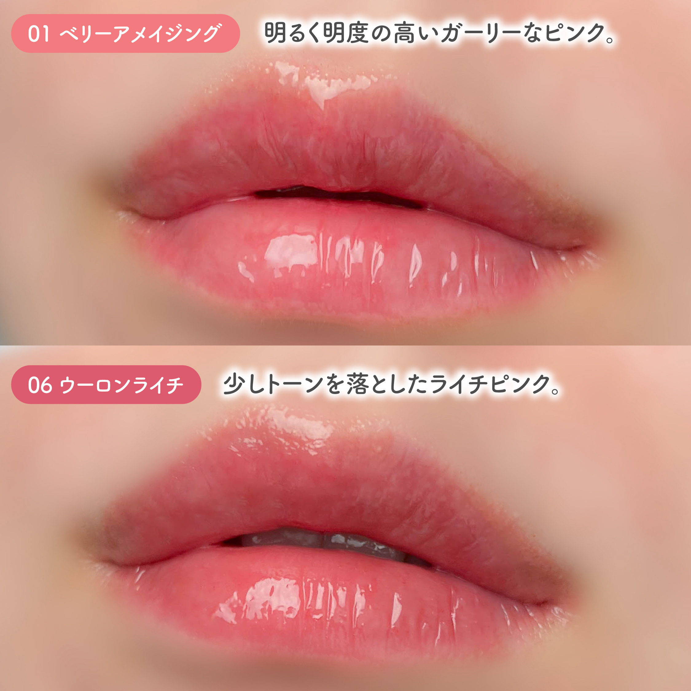 - <01 ベリーアメイジング> 水、デカイソステアリン酸ポリグリセリル-10、ビスジグリセリルポリアシルアジペート-2、ジフェニルジメチコン、フェニルトリメチコン、リンゴ酸ジイソステアリル、水添ポリイソブテン、ジグリセリン、ポリソルベート60、BG、セチルPEG/PPG-10/1ジメチコン、1,2-ヘキサンジオール、ペンチレングリコール、セテアレス-20、(アクリル酸ヒドロキシエチル/アクリロイルジメチルタウリンNa)コポリマー、スクワラン、フェノキシエタノール、エチルヘキシルグリセリン、香料、黄5、酸化チタン、イソステアリン酸ソルビタン、赤104(1)、赤227、水酸化Al、ポリアクリル酸アンモニウム、トコフェロール <02 アプリコットデュー> 水、デカイソステアリン酸ポリグリセリル-10、ビスジグリセリルポリアシルアジペート-2、ジフェニルジメチコン、フェニルトリメチコン、リンゴ酸ジイソステアリル、水添ポリイソブテン、ジグリセリン、ポリソルベート60、BG、セチルPEG/PPG-10/1ジメチコン、1,2-ヘキサンジオール、ペンチレングリコール、セテアレス-20、(アクリル酸ヒドロキシエチル/アクリロイルジメチルタウリンNa)コポリマー、スクワラン、フェノキシエタノール、酸化チタン、エチルヘキシルグリセリン、香料、黄4、黄5、イソステアリン酸ソルビタン、赤227、赤104(1)、水酸化Al、ポリアクリル酸アンモニウム、青1、トコフェロール <03 メリーピーチ> 水、デカイソステアリン酸ポリグリセリル-10、ビスジグリセリルポリアシルアジペート-2、ジフェニルジメチコン、フェニルトリメチコン、リンゴ酸ジイソステアリル、水添ポリイソブテン、ジグリセリン、ポリソルベート60、BG、セチルPEG/PPG-10/1ジメチコン、1,2-ヘキサンジオール、ペンチレングリコール、セテアレス-20、(アクリル酸ヒドロキシエチル/アクリロイルジメチルタウリンNa)コポリマー、スクワラン、フェノキシエタノール、酸化チタン、エチルヘキシルグリセリン、香料、黄4、赤227、イソステアリン酸ソルビタン、黄5、赤104(1)、水酸化Al、ポリアクリル酸アンモニウム、青1、トコフェロール <04 プラウドグレープ> 水、デカイソステアリン酸ポリグリセリル-10、ビスジグリセリルポリアシルアジペート-2、ジフェニルジメチコン、フェニルトリメチコン、リンゴ酸ジイソステアリル、水添ポリイソブテン、ジグリセリン、ポリソルベート60、BG、セチルPEG/PPG-10/1ジメチコン、1,2-ヘキサンジオール、ペンチレングリコール、セテアレス-20、(アクリル酸ヒドロキシエチル/アクリロイルジメチルタウリンNa)コポリマー、スクワラン、フェノキシエタノール、エチルヘキシルグリセリン、酸化チタン、香料、赤104(1)、黄4、イソステアリン酸ソルビタン、赤227、水酸化Al、ポリアクリル酸アンモニウム、青1、トコフェロール <05 レベルアップベリー> 水、デカイソステアリン酸ポリグリセリル-10、ビスジグリセリルポリアシルアジペート-2、ジフェニルジメチコン、フェニルトリメチコン、リンゴ酸ジイソステアリル、水添ポリイソブテン、ジグリセリン、ポリソルベート60、BG、セチルPEG/PPG-10/1ジメチコン、1,2-ヘキサンジオール、ペンチレングリコール、セテアレス-20、(アクリル酸ヒドロキシエチル/アクリロイルジメチルタウリンNa)コポリマー、スクワラン、フェノキシエタノール、エチルヘキシルグリセリン、香料、黄5、赤227、イソステアリン酸ソルビタン、青1、トコフェロール <06 ウーロンライチ> 水、デカイソステアリン酸ポリグリセリル-10、ビスジグリセリルポリアシルアジペート-2、ジフェニルジメチコン、フェニルトリメチコン、リンゴ酸ジイソステアリル、水添ポリイソブテン、ジグリセリン、ポリソルベート60、BG、セチルPEG/PPG-10/1ジメチコン、1,2-ヘキサンジオール、ペンチレングリコール、セテアレス-20、(アクリル酸ヒドロキシエチル/アクリロイルジメチルタウリンNa)コポリマー、スクワラン、フェノキシエタノール、酸化チタン、エチルヘキシルグリセリン、赤227、黄4、香料、イソステアリン酸ソルビタン、水酸化Al、ポリアクリル酸アンモニウム、青1、トコフェロール <07 プロップフィグ> 水、デカイソステアリン酸ポリグリセリル-10、ビスジグリセリルポリアシルアジペート-2、ジフェニルジメチコン、フェニルトリメチコン、リンゴ酸ジイソステアリル、水添ポリイソブテン、ジグリセリン、ポリソルベート60、BG、セチルPEG/PPG-10/1ジメチコン、1,2-ヘキサンジオール、ペンチレングリコール、セテアレス-20、(アクリル酸ヒドロキシエチル/アクリロイルジメチルタウリンNa)コポリマー、スクワラン、フェノキシエタノール、エチルヘキシルグリセリン、黄5、赤227、香料、イソステアリン酸ソルビタン、青1、トコフェロール <08 ジョイフルパーシモン> 水、デカイソステアリン酸ポリグリセリル-10、ビスジグリセリルポリアシルアジペート-2、ジフェニルジメチコン、フェニルトリメチコン、リンゴ酸ジイソステアリル、水添ポリイソブテン、ジグリセ