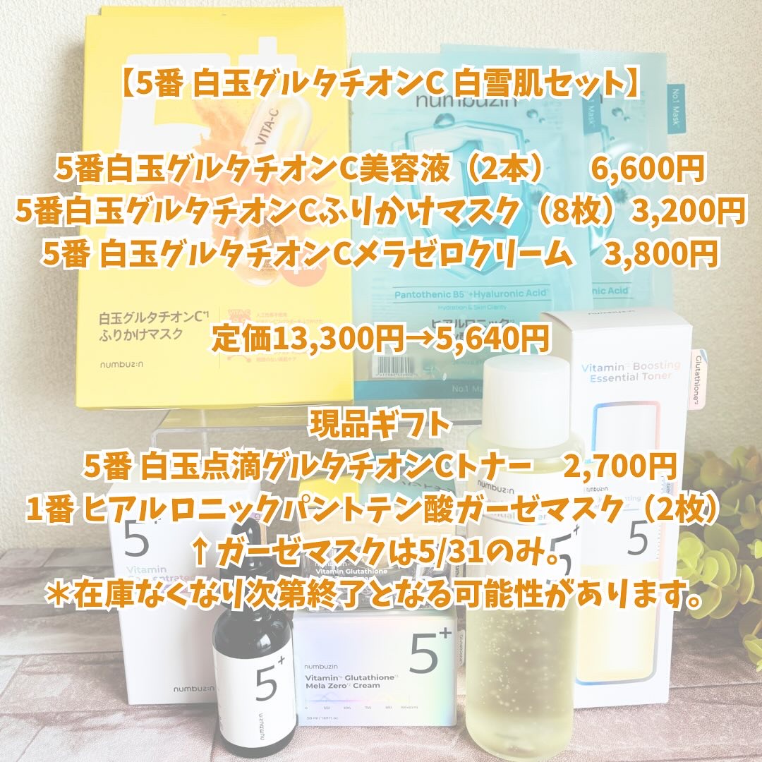 💛skincare💛.✔︎ナンバーズイン 5番白玉グルタチオンC白雪肌セット定価13,300円→5,640円👀さらに定価2,700円の5番トナー現品をギフト💝お得すぎるメガ割!.お得すぎるセットは5番美容液×25番シートマスク8枚5番クリーム...