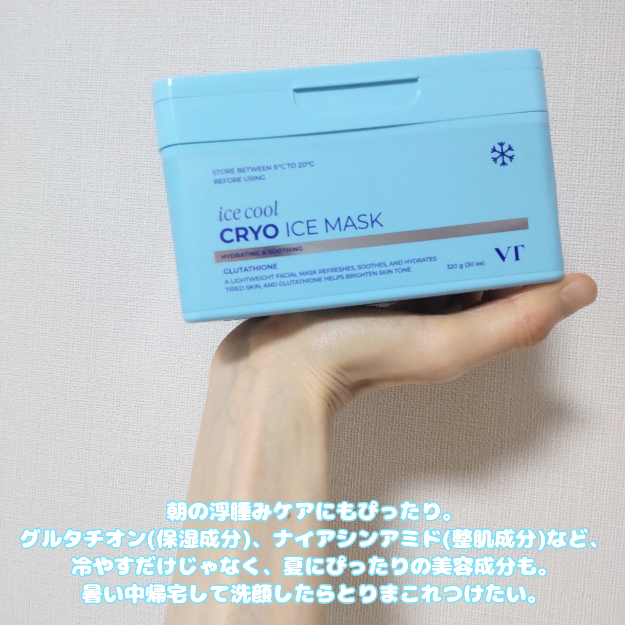 #PR#VT❤︎VT/クライオアイスマスク30枚(320g)¥2,640¥2,640つけた直後からほどよく冷感🧊キンキンではなく丁度良い冷たさでパック中とても気持ちがよかったです!夏にピッタリ☀️冷蔵庫で冷やさなくてもこの感覚ならばとても便利...