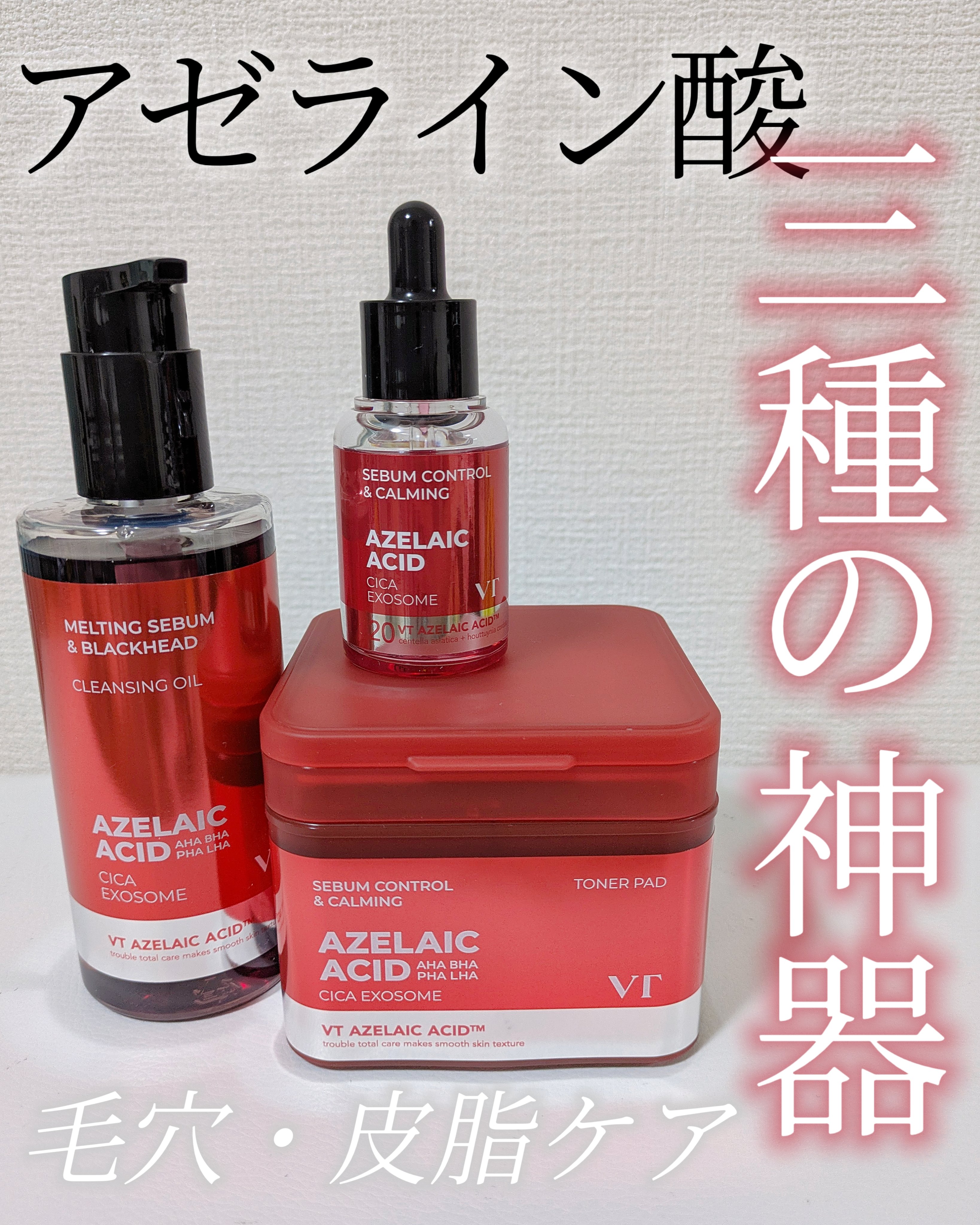 VTの『アゼライン酸*¹』三種の神器👼🏻✨VT(@vt_cosmetics_jp)様よりいただきました!高純度99%*²のアゼライン酸*¹配合のクレンジング・トナーパッド・美容液の3種をご紹介します❣️▶︎AZケアクレンジングオイルサラサラな...