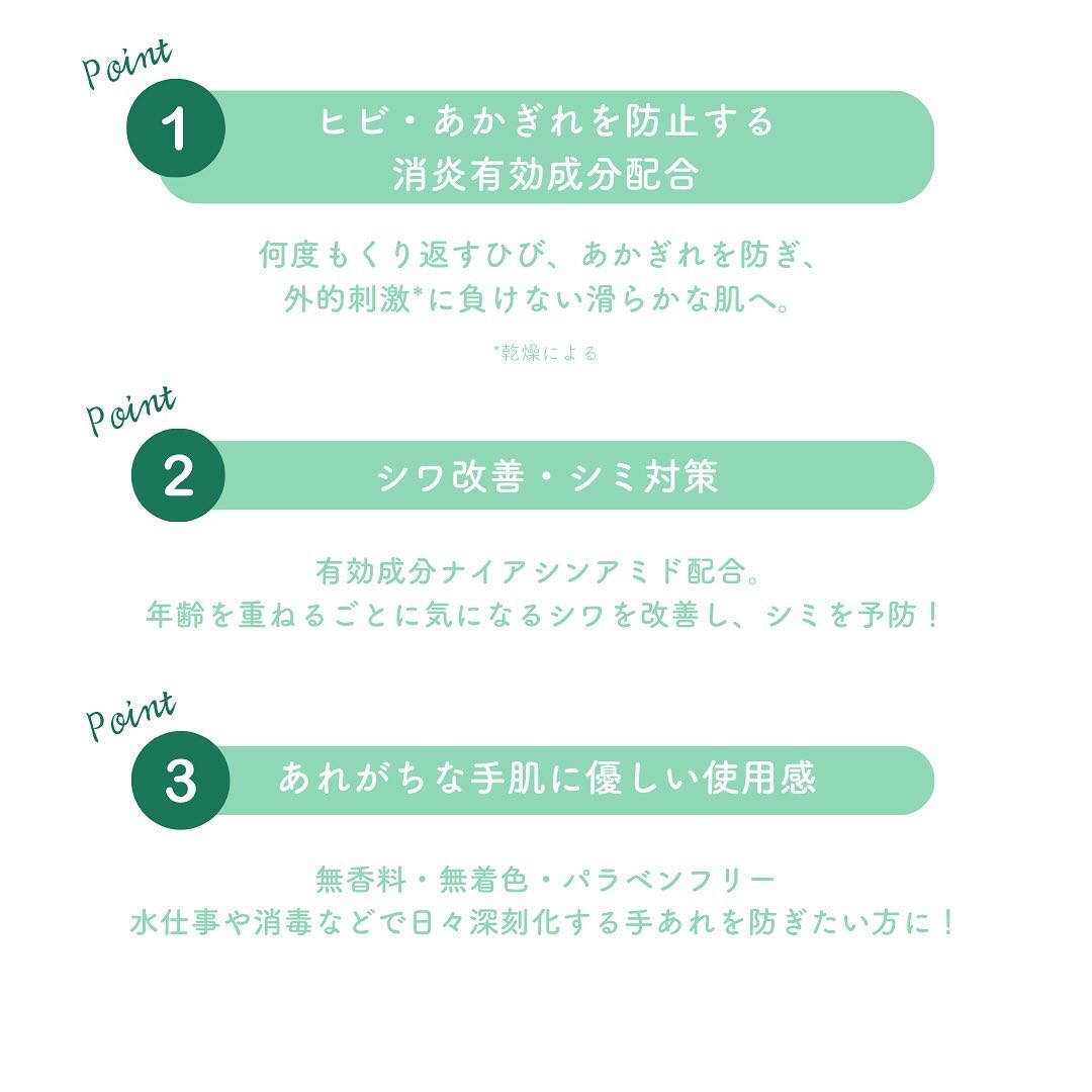 - 薬用CICAリペア ハンドクリーム 薬用消炎×強力撥水効果を備えた手あれ対策する薬用ハンドクリーム。 ヒビ・あかぎれなどの手あれの悪循環から肌をまもり、なめらかな手肌へ。 消炎有効成分 グリチルリチン酸ジカリウム配合。 シワ改善・美白★有効成分ナイアシンアミド配合。 無着色・パラベンフリー ★メラニンの生成を抑え、シミ・ソバカスを防ぐ。