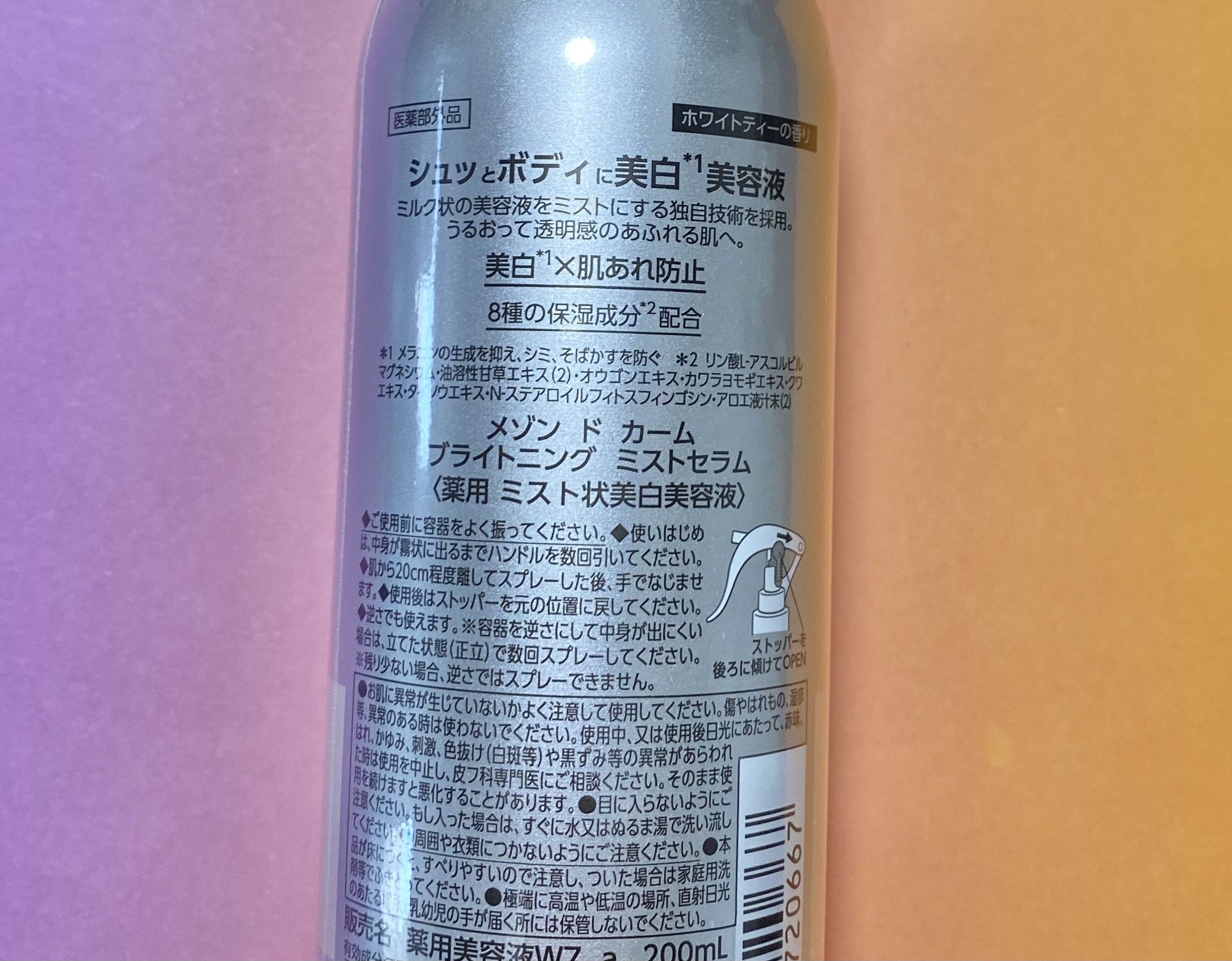 - 【医薬部外品】 片手でシュッとケアできる ミストタイプのボディ用美白*1美容液 ●ミルク状の美容液をナノサイズ化する独自技術で、肌の上にとどまりがちな保湿成分が角質層まで浸透。 ●べたつかずにしっかり潤って透明感のあふれる肌へ。 ●逆さにしても使えるトリガータイプのスプレーなので、背中のケアにも。 ●医薬部外品の有効成分【プラセンタエキス(1)】【グリチルレチン酸ステアリル】を配合し、全身の美白*1と肌あれ防止を叶えます。 ●ビタミン C 誘導体*2やセラミド*3・カンゾウエキス*4・オウゴンエキス・カワラヨモギエキス・クワエキス・タイソウエキス・アロエエキス*5などの植物性保湿成分配合。 ●アルコールフリー・無鉱物オイル・無タール系色素。 ●爽やかで心地よいホワイトティーの香り。 *1 メラニンの生成を抑え、シミ・ソバカスを防ぐ *2 リン酸 L-アスコルビルマグネシウム *3 N-ステアロイルフィトスフィンゴシン *4 油溶性甘草エキス(2) *5 アロエ液汁末(2) 販売名:薬用美容液W7 a