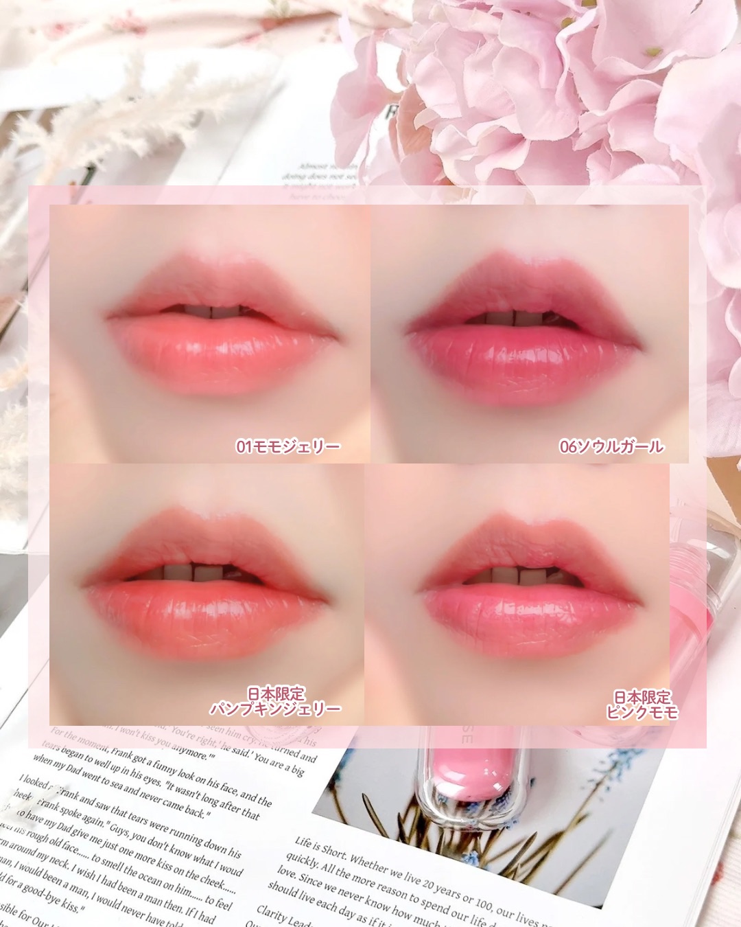 - <01 モモジェリー> Water、Diphenyl Dimethicone、Diisostearyl Malate、Bis-Diglyceryl Polyacyladipate-2、Hydrogenated Polyisobutene、Bis-Behenyl/Isostearyl/Phytosteryl Dimer Dilinoleyl Dimer Dilinoleate、Cetyl PEG/PPG-10/1 Dimethicone、Diglycerin、Hydrogenated Polydecene、Dipropylene Glycol、Polysorbate 60、Sorbitan Isostearate、Hydroxyethyl Acrylate/Sodium Acryloyldimethyl Taurate Copolymer、Pentylene Glycol、Squalane、Titanium Dioxide (CI 77891)、Ethylene/Propylene Copolymer、Ceteareth-20、Phenoxyethanol、Polyglycerin-3、Yellow 5 (CI 19140)、Red 33 (CI 17200)、Fragrance、Ethylhexylglycerin、Glycerin、Aluminum Hydroxide、Ammonium Polyacrylate、Yellow 6 (CI 15985)、Butylene Glycol、Blue 1 (CI 42090)、Tocopheryl Acetate、Prunus Persica (Peach) Fruit Extract、1,2-Hexanediol、Sodium Hyaluronate、Hydroxypropyltrimonium Hyaluronate、Sodium Acetylated Hyaluronate、Hydrolyzed Hyaluronic acid、Hyaluronic Acid、Sodium Hyaluronate Crosspolymer、Hydrolyzed Sodium Hyaluronate、Potassium Hyaluronate <02 ヘルシーサーモン> Water、Diphenyl Dimethicone、Diisostearyl Malate、Bis-Diglyceryl Polyacyladipate-2、Hydrogenated Polyisobutene、Bis-Behenyl/Isostearyl/Phytosteryl Dimer Dilinoleyl Dimer Dilinoleate、Cetyl PEG/PPG-10/1 Dimethicone、Diglycerin、Hydrogenated Polydecene、Dipropylene Glycol、Polysorbate 60、Sorbitan Isostearate、Hydroxyethyl Acrylate/Sodium Acryloyldimethyl Taurate Copolymer、Pentylene Glycol、Squalane、Ethylene/Propylene Copolymer、Ceteareth-20、Phenoxyethanol、Titanium Dioxide (CI 77891)、Polyglycerin-3、Yellow 6 (CI 15985)、Fragrance、Ethylhexylglycerin、Red 33 (CI 17200)、Glycerin、Red 28 (CI 45410)、Aluminum Hydroxide、Ammonium Polyacrylate、Yellow 5 (CI 19140)、Butylene Glycol、Tocopheryl Acetate、Blue 1 (CI 42090)、Prunus Persica (Peach) Fruit Extract、1,2-Hexanediol、Sodium Hyaluronate、Hydroxypropyltrimonium Hyaluronate、Sodium Acetylated Hyaluronate、Hydrolyzed Hyaluronic acid、Hyaluronic Acid、Sodium Hyaluronate Crosspolymer、Hydrolyzed Sodium Hyaluronate、Potassium Hyaluronate <03 ヌーディーピンク> Water、Diphenyl Dimethicone、Diisostearyl Malate、Bis-Diglyceryl Polyacyladipate-2、Hydrogenated Polyisobutene、Bis-Behenyl/Isostearyl/Phytosteryl Dimer Dilinoleyl Dimer Dilinoleate、Cetyl PEG/PPG-10/1 Dimethicone、Diglycerin、Hydrogenated Polydecene、Dipropylene Glycol、Polysorbate 60、Sorbitan Isostearate、Hydroxyethyl Acrylate/Sodium Acryloyldimethyl Taurate Copolymer、Pentylene Glycol、Squalane、Ethylene/Propylene Copolymer、Ceteareth-20、Titanium Dioxide (CI 77891)、Phenoxyethanol、Polyglycerin-3、Red 33 (CI 17200)、Yellow 5 (CI 19140)、Fragrance、Ethylhexylglycerin、Glycerin、Aluminum Hydroxide、Ammonium Polyacrylate、Butylene Glycol、Blue 1 (CI 42090)、Tocopheryl Acetate、Prunus Persica (Peach) Fruit Extract、1,2-Hexanediol、Sodium Hyaluronate、Hydroxypropyltrimonium Hyaluronate、Sodium Acetylated Hyaluronate、Hydrolyzed Hyaluronic acid、Hyaluronic Acid、Sodium Hyaluronate Crosspolymer、Hydrolyzed Sodium Hyaluronate、Potassium Hyaluronate <04 ローズミルク> Water、Diphenyl Dimethicone、Diisostearyl Malate、Bis-Diglyceryl Polyacyladipate-2、Hydrogenated Polyisobutene、Bis-Behenyl/Isostearyl/Phytosteryl Dimer Dilinoleyl Dimer Dilinoleate、Cetyl PEG/PPG-10/1 Dimethicone、Diglycerin、Hydrogenated Polydecene、Dipropylene Glycol、Polysorbate 60、Sorbitan Isostearate、Hydroxyethyl Acrylate/Sodium Acryloyldimethyl Taurate Copolymer、Pentylene Glycol、Squalane、Ethylene/Propylene Copolymer、Ceteareth-20、Titanium Dioxide (CI 77891)、Phenoxyethanol、Polyglycerin-3、Red 28 (CI 45410)、Yellow 6 (CI 15985)、Fragrance、Ethylhexylglycerin、Red 33 (CI 17200)、Glycerin、Aluminum Hydroxide、Ammonium Polyacrylate、Butylene Glycol、Blue 1 (CI 42090)、Tocopheryl Acetate、Prunus Persica (Peach) Fruit Extract、1,2-Hexanediol、Sodium Hyaluronate、Hydroxypropyltrimonium Hyaluronate、Sodium Acetylated Hyaluronate、Hydrolyzed Hyaluronic acid、Hyaluronic Acid、Sodium Hyaluronate Crosspolymer、Hydrolyzed Sodium Hyaluronate、Potassium Hyaluronate <05 ベージュフィグ> Water、Diphenyl Dimethicone、Diisostearyl Malate、Bis-Diglyceryl Polyacyladipate-2、Hydrogenated Polyisobutene、Bis-Behenyl/Isostearyl/Phytosteryl Dimer Dilinoleyl Dimer Dilinoleate、Cetyl PEG/PPG-10/1 Dimethicone、Diglycerin、Hydrogenated Polydecene、Dipropylene Glycol、Polysorbate 60、Sorbitan Isostearate、Hydroxyethyl Acrylate/Sodium Acryloyldimethyl Taurate Copolymer、Pentylene Glycol、Squalane、Titanium Dioxide (CI 77891)、Ethylene/Propylene Copolymer、Ceteareth-20、Phenoxyethanol、Polyglycerin-3、Yellow 5 (CI 19140)、Red 33 (CI 17200)、Fragrance、Ethylhexylglycerin、Yellow 6 (CI 15985)、Glycerin、Aluminum Hydroxide、Ammonium Polyacrylate、Butylene Glycol、Blue 1 (CI 42090)、Tocopheryl Acetate、Prunus Persica (Peach) Fruit Extract、1,2-Hexanediol、Sodium Hyaluronate、Hydroxypropyltrimonium Hyaluronate、Sodium Acetylated Hyaluronate、Hydrolyzed Hyaluronic acid、Hyaluronic Acid、Sodium Hyaluronate Crosspolymer、Hydrolyzed Sodium Hyaluronate、Potassium Hyaluronate <06 ソウルガール> Water、Diphenyl Dimethicone、Diisostearyl Malate、Bis-Diglyceryl Polyacyladipate-2、Hydrogenated Polyisobutene、Bis-Behenyl/Isostearyl/Phytosteryl Dimer Dilinoleyl Dimer Dilinoleate、Cetyl PEG/PPG-10/1 Dimethicone、Diglycerin、Hydrogenated Polydecene、Dipropylene Glycol、Polysorbate 60、Sorbitan Isostearate、Hydroxyethyl Acrylate/Sodium Acryloyldimethyl Taurate Copolymer、Pentylene Glycol、Squalane、Ethylene/Propylene Copolymer、Ceteareth-20、Titanium Dioxide (CI 77891)、Phenoxyethanol、Polyglycerin-3、Red 33 (CI 17200)、Yellow 6 (CI 15985)、Fragrance、Ethylhexylglycerin、Yellow 5 (CI 19140)、Glycerin、Aluminum Hydroxide、Ammonium Polyacrylate、Blue 1 (CI 42090)、Butylene Glycol、Tocopheryl Acetate