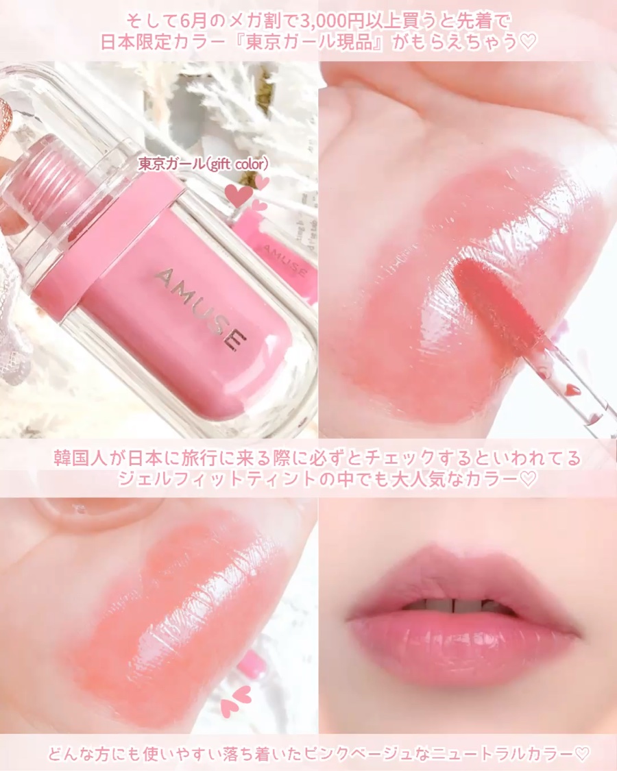 #PR\メガ割でノベルティキャンペーン🎁⋆*/AMUSEのジェルフィットティント✨5/31から始まるメガ割では、3000円以上購入すると先着で「東京ガール」っていう日本限定カラーの現品が貰えるキャンペーンをしてるよ👀̖́-東京ガールはニュート...