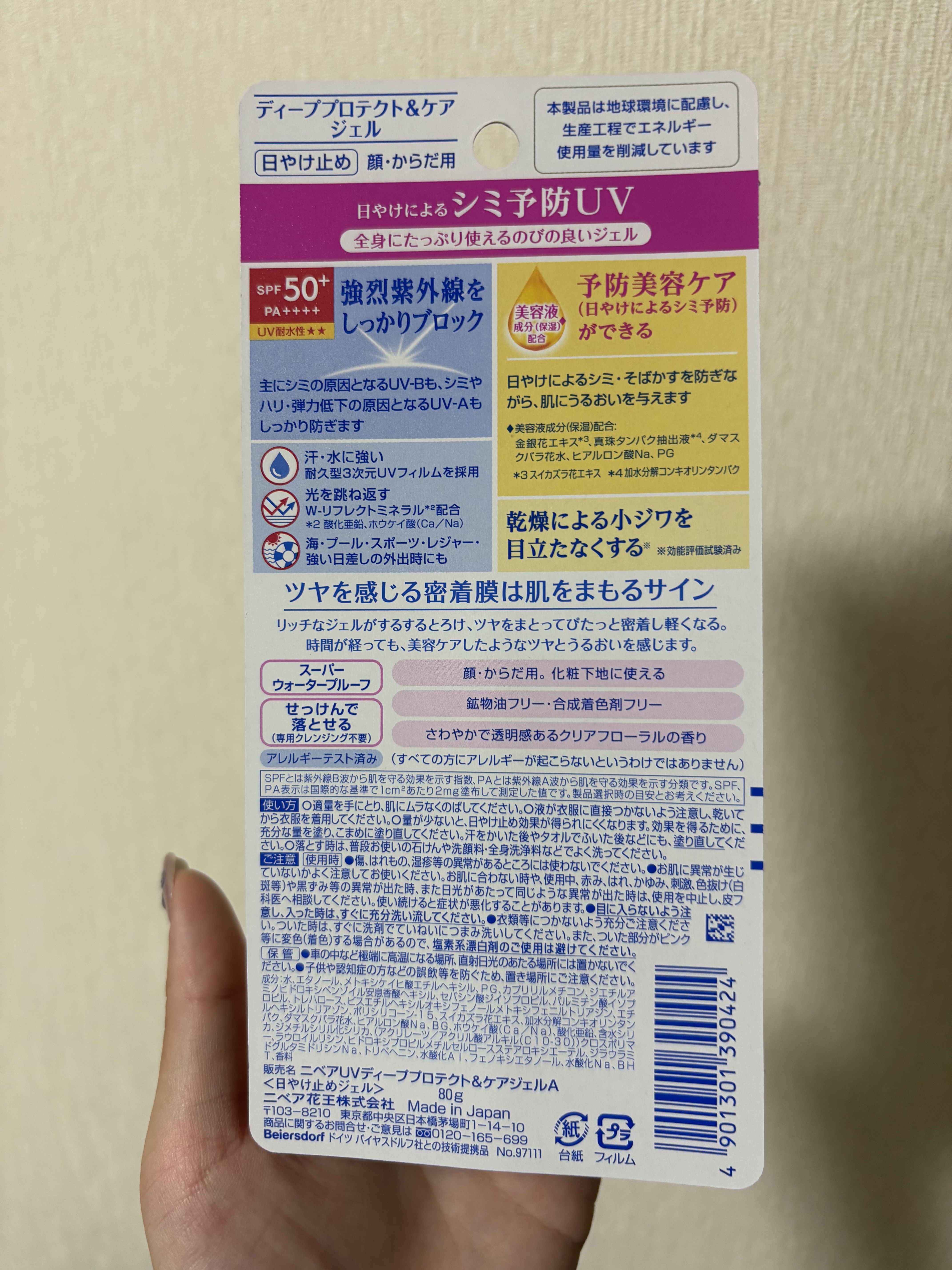 新 日やけによるシミ予防UV 全身にたっぷり使えるのびの良いジェル 日焼け止めっぽくない爽やかな香りがうれしい!とろーっとしてるのでのびがいい。 石鹸で落とせるのが便利!