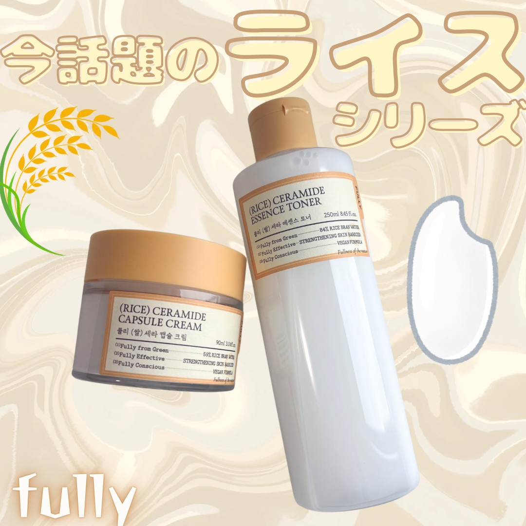 FULLY▷米セラミドエッセンストナー 米セラミドカプセルクリームフリーの米セラミドラインのトナーとクリーム🌾トナーは乳白色のとろみのあるテクスチャでエッセンスとの2in1✨しっとりだけど重たくないので朝にも使いやすいよ💕コットンに浸して贅沢...