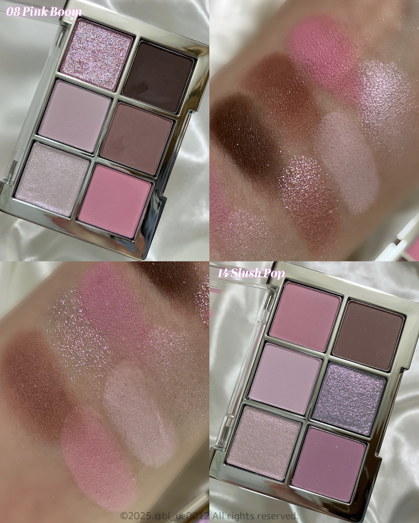 白みをたっぷり含んだカラーがかわいい💜 03 ラベンダープレジャー🫧 上段中央のシマーなラベンダービームのハイライトカラーがとても綺麗だった🥹🤍 トーンを合わせたカラー構成で異なる質感を楽しめるそんなパレットになっています💗