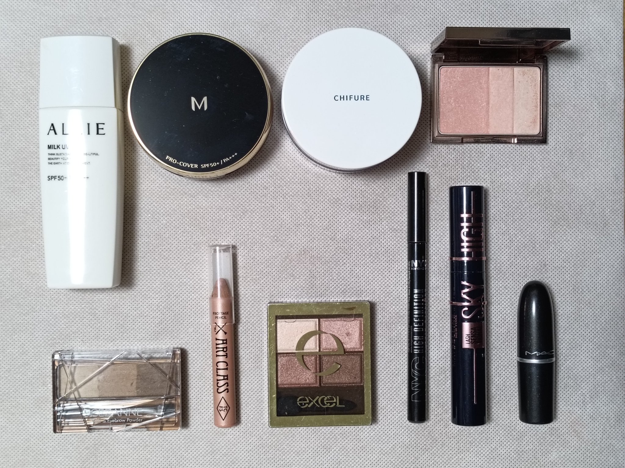 アリィー ニュアンスチェンジUV ジェル RSを、顔全体にまんべんなく塗ります。 RMK RMK ジェルクリーミィファンデーション 103を、顔全体にまんべんなく塗ります。 ジョンソンベビー ジョンソン ベビーパウダーを、顔全体にまんべんなく軽くはたきます。 THE BODY SHOP bronze shade warm glowを、両頬に塗ります。 KATE リフレクトミラーアイズ BR-1の締め色を、眉毛全体にまんべんなく塗ります。 URGLAM UR GLAMBLOOMING EYE COLOR PALETTE 01を、使用しました。 ちふれ リキッド アイライナー 筆ペンタイプ BK30 ブラックを、塗ります。 CEZANNE エアリーカールマスカラを、まつ毛全体にまんべんなく塗ります。 MAYBELLINE NEW YORK コロッサルボリュームエクスプレスを、まつ毛全体にまんべんなく塗ります。 MAYBELLINE NEW YORK SPステイ マットインク 135を、唇全体にまんべんなく塗ります。