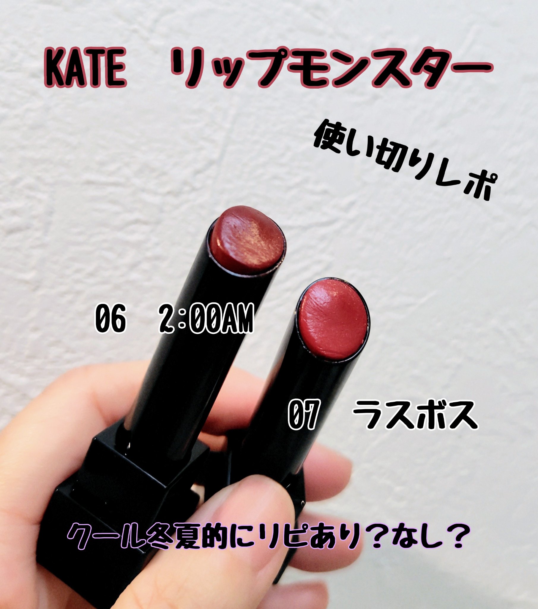 使い切りました💄 KATE リップモンスター 06 2:00AM 07 ラスボス ✼••┈┈••✼••┈┈••✼••┈┈••✼••┈┈••✼ 大好きリップモンスター✨ ブルベ向きっぽいこちら2つですが 悲しいかな黄み転びします〜〜〜😭 それはそれはオレンジに発色します🍊 いや、別に黄み転びしてもいいんだけどさ… ただっ!! rom&nd ベターザンアイズ  N02 ドライバイオレット の投稿で貼り付けた通り ブルベ度100%なんですよぅ🤣 プロ診断も 🥇1st クールウィンター 🥈2nd クールサマー ですからね… とにかく青みに寄らせてください🙇🏻‍♀️ てことで 次買うときは 誓いのルビーの一択です🤗
