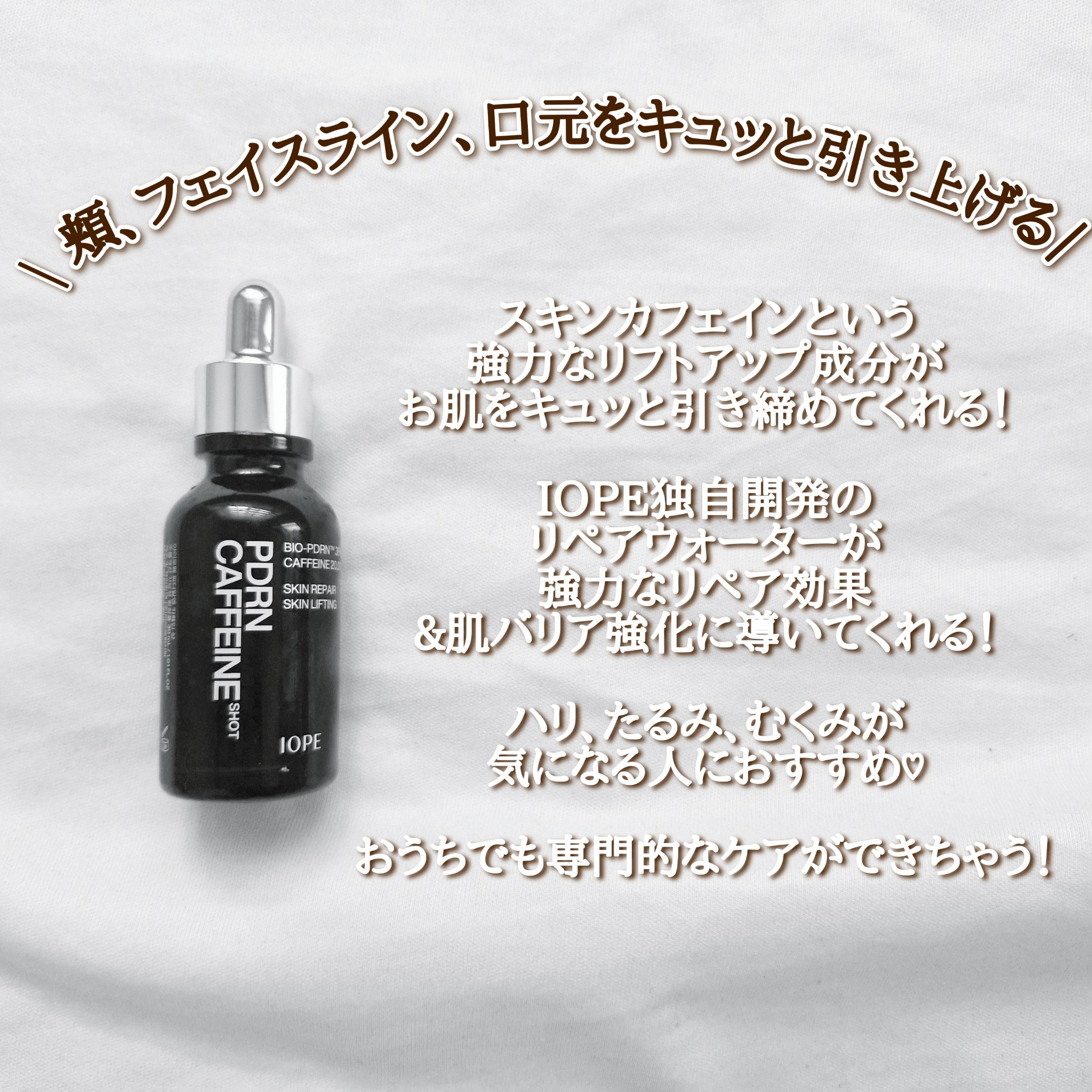 【使った商品】IOPE:PDRNカフェインショット【商品の特徴】①強力なリフトアップ成分スキンカフェインスキンカフェインで肌をキュッと引き締め、フェイスラインと口角を引き上げ顔のむくみもすっきり改善②独自開発したリペアウォーターBio-PDR...