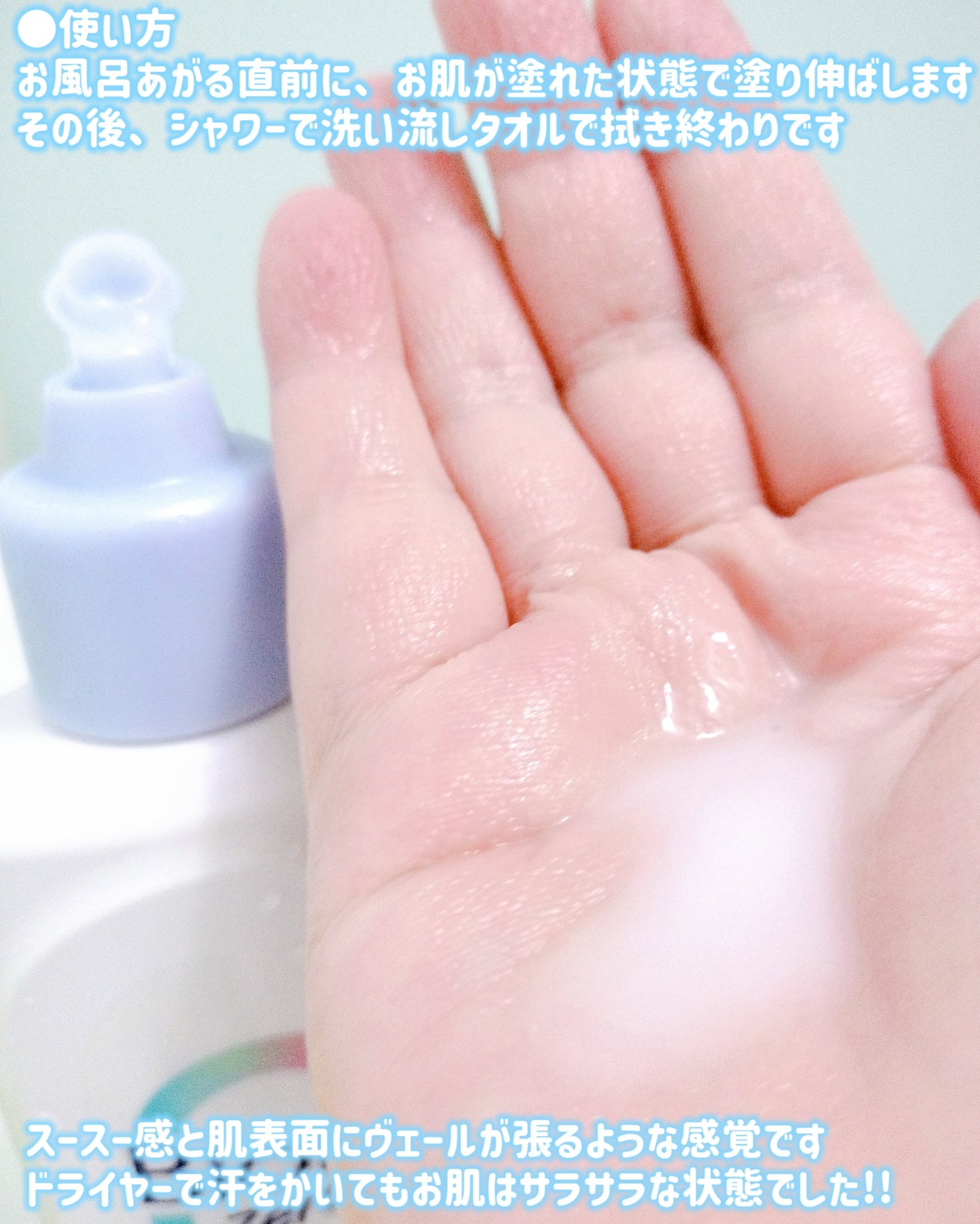 - お風呂で使って、長時間さらっと快適続く汗ケアローション お風呂後のドライヤー時や、就寝時の汗にも持続型パウダーヴェールでずーっと快適 ● 汗を乾かし続けるパウダーがヴェールのように肌を包み込むから、心地よいさらさら感が持続 ● 独自のシャワー型キャップで、手の届きにくい背中もラクラク ● 清涼成分(メントール)配合 ● 肌を整える 保湿成分(BG)配合 ● 無香性
