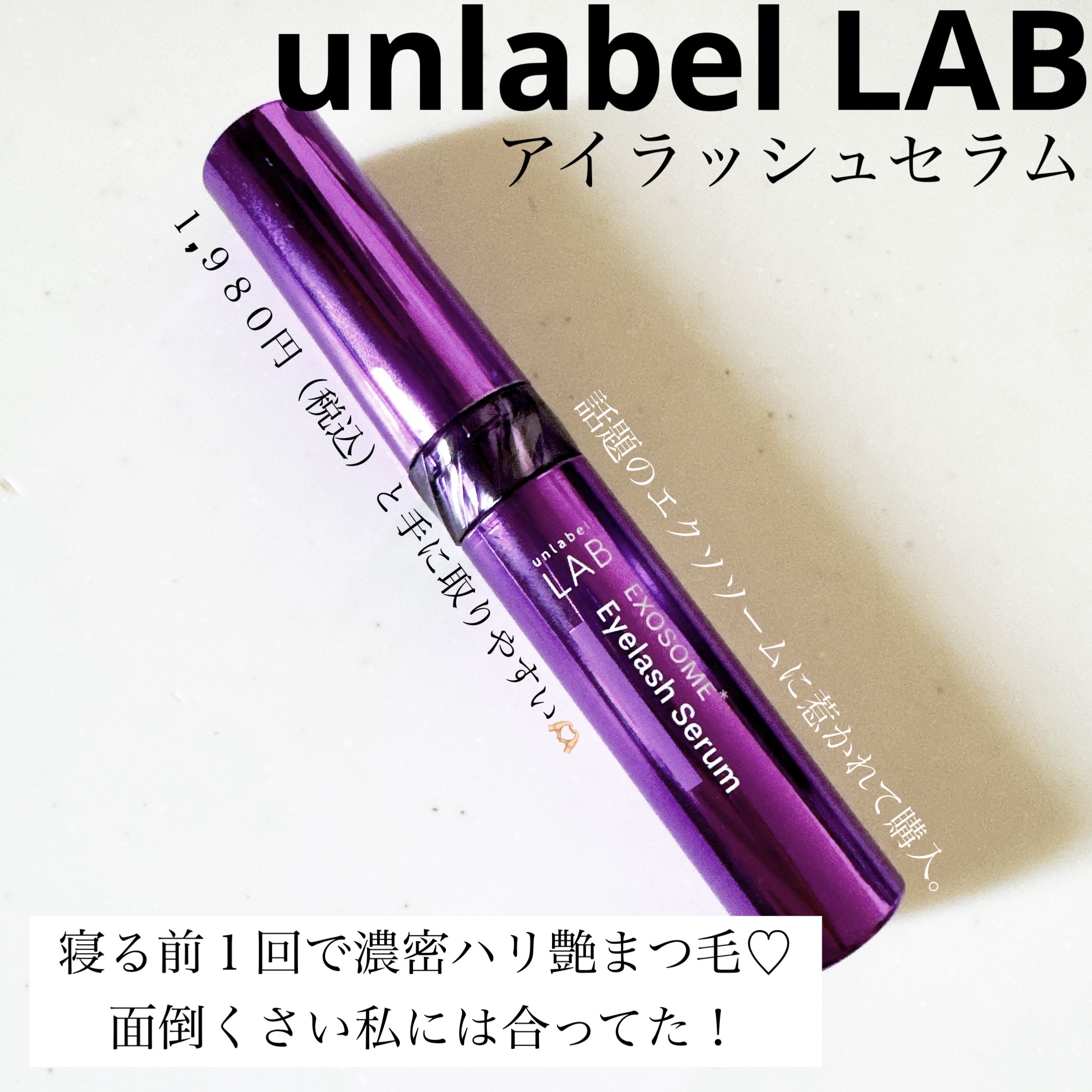 独自開発の超高圧浸透型エクソソーム配合!濃密まつ毛集中美容液「アンレーベルラボEXアイラッシュセラム」をお試ししてみました!わかるかな?こだわりのブラシ形状に先端のボールチップが塗りやすいの。毛根幹細胞培養液やまつ毛ラッシュ成分、12種類のア...