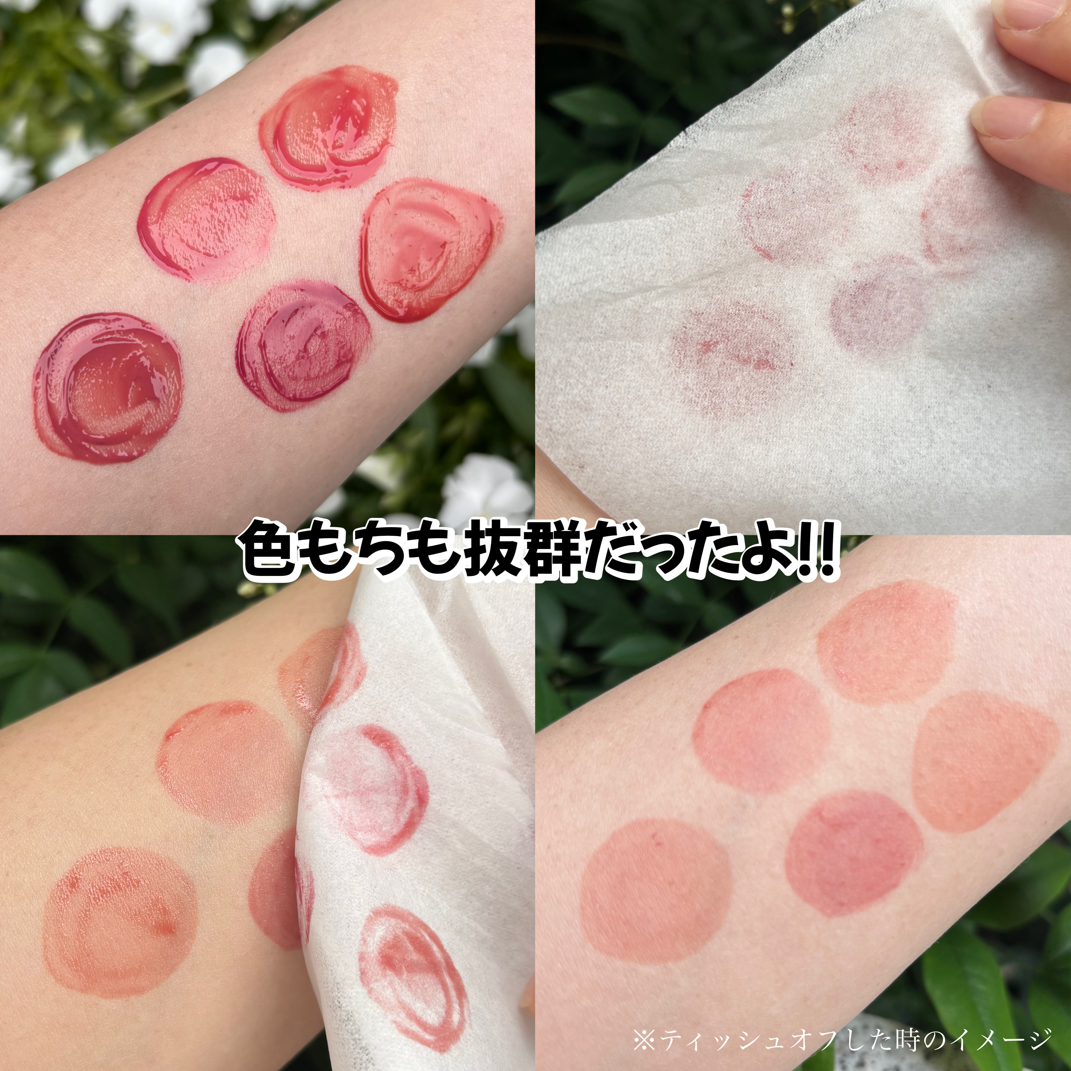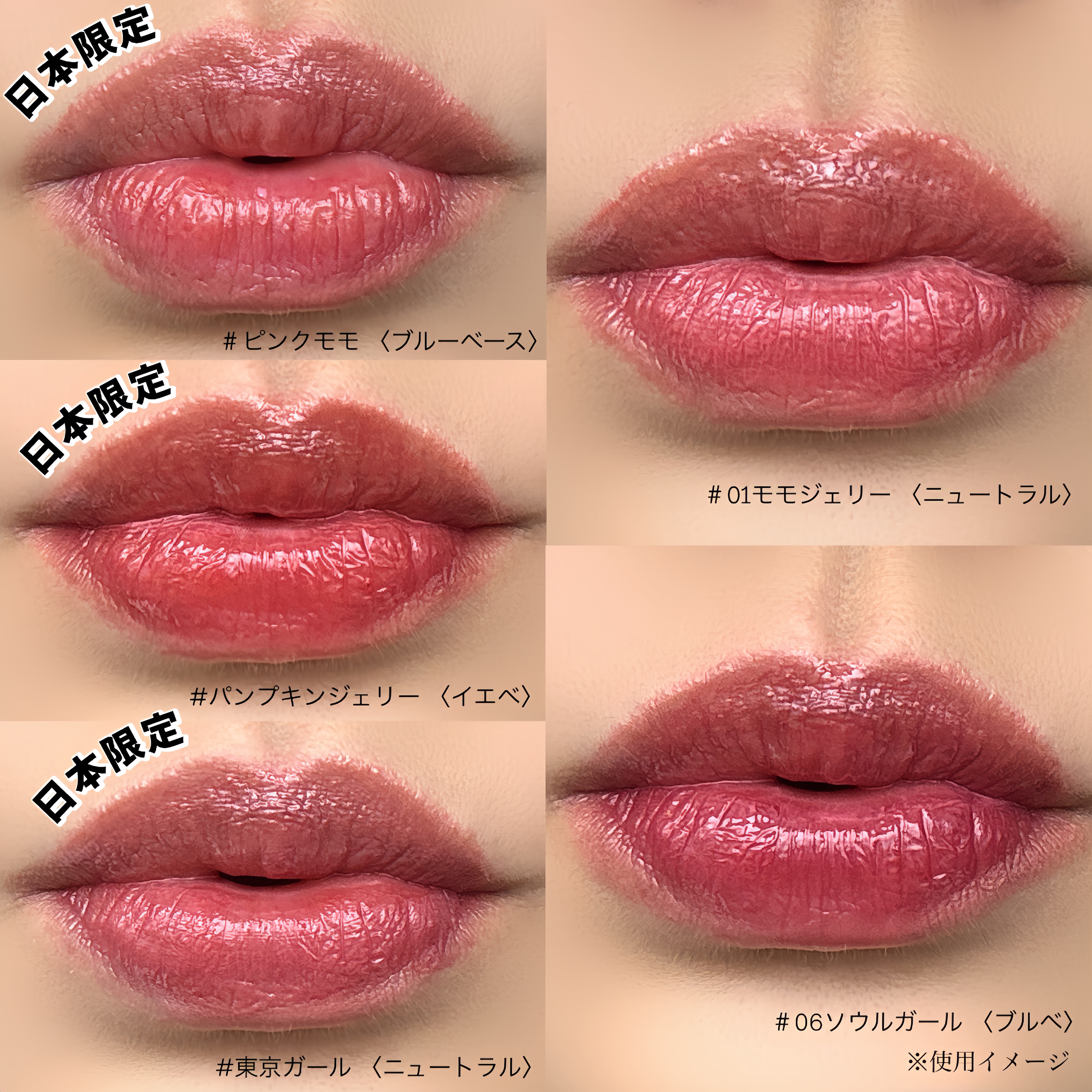- <01 モモジェリー> Water、Diphenyl Dimethicone、Diisostearyl Malate、Bis-Diglyceryl Polyacyladipate-2、Hydrogenated Polyisobutene、Bis-Behenyl/Isostearyl/Phytosteryl Dimer Dilinoleyl Dimer Dilinoleate、Cetyl PEG/PPG-10/1 Dimethicone、Diglycerin、Hydrogenated Polydecene、Dipropylene Glycol、Polysorbate 60、Sorbitan Isostearate、Hydroxyethyl Acrylate/Sodium Acryloyldimethyl Taurate Copolymer、Pentylene Glycol、Squalane、Titanium Dioxide (CI 77891)、Ethylene/Propylene Copolymer、Ceteareth-20、Phenoxyethanol、Polyglycerin-3、Yellow 5 (CI 19140)、Red 33 (CI 17200)、Fragrance、Ethylhexylglycerin、Glycerin、Aluminum Hydroxide、Ammonium Polyacrylate、Yellow 6 (CI 15985)、Butylene Glycol、Blue 1 (CI 42090)、Tocopheryl Acetate、Prunus Persica (Peach) Fruit Extract、1,2-Hexanediol、Sodium Hyaluronate、Hydroxypropyltrimonium Hyaluronate、Sodium Acetylated Hyaluronate、Hydrolyzed Hyaluronic acid、Hyaluronic Acid、Sodium Hyaluronate Crosspolymer、Hydrolyzed Sodium Hyaluronate、Potassium Hyaluronate <02 ヘルシーサーモン> Water、Diphenyl Dimethicone、Diisostearyl Malate、Bis-Diglyceryl Polyacyladipate-2、Hydrogenated Polyisobutene、Bis-Behenyl/Isostearyl/Phytosteryl Dimer Dilinoleyl Dimer Dilinoleate、Cetyl PEG/PPG-10/1 Dimethicone、Diglycerin、Hydrogenated Polydecene、Dipropylene Glycol、Polysorbate 60、Sorbitan Isostearate、Hydroxyethyl Acrylate/Sodium Acryloyldimethyl Taurate Copolymer、Pentylene Glycol、Squalane、Ethylene/Propylene Copolymer、Ceteareth-20、Phenoxyethanol、Titanium Dioxide (CI 77891)、Polyglycerin-3、Yellow 6 (CI 15985)、Fragrance、Ethylhexylglycerin、Red 33 (CI 17200)、Glycerin、Red 28 (CI 45410)、Aluminum Hydroxide、Ammonium Polyacrylate、Yellow 5 (CI 19140)、Butylene Glycol、Tocopheryl Acetate、Blue 1 (CI 42090)、Prunus Persica (Peach) Fruit Extract、1,2-Hexanediol、Sodium Hyaluronate、Hydroxypropyltrimonium Hyaluronate、Sodium Acetylated Hyaluronate、Hydrolyzed Hyaluronic acid、Hyaluronic Acid、Sodium Hyaluronate Crosspolymer、Hydrolyzed Sodium Hyaluronate、Potassium Hyaluronate <03 ヌーディーピンク> Water、Diphenyl Dimethicone、Diisostearyl Malate、Bis-Diglyceryl Polyacyladipate-2、Hydrogenated Polyisobutene、Bis-Behenyl/Isostearyl/Phytosteryl Dimer Dilinoleyl Dimer Dilinoleate、Cetyl PEG/PPG-10/1 Dimethicone、Diglycerin、Hydrogenated Polydecene、Dipropylene Glycol、Polysorbate 60、Sorbitan Isostearate、Hydroxyethyl Acrylate/Sodium Acryloyldimethyl Taurate Copolymer、Pentylene Glycol、Squalane、Ethylene/Propylene Copolymer、Ceteareth-20、Titanium Dioxide (CI 77891)、Phenoxyethanol、Polyglycerin-3、Red 33 (CI 17200)、Yellow 5 (CI 19140)、Fragrance、Ethylhexylglycerin、Glycerin、Aluminum Hydroxide、Ammonium Polyacrylate、Butylene Glycol、Blue 1 (CI 42090)、Tocopheryl Acetate、Prunus Persica (Peach) Fruit Extract、1,2-Hexanediol、Sodium Hyaluronate、Hydroxypropyltrimonium Hyaluronate、Sodium Acetylated Hyaluronate、Hydrolyzed Hyaluronic acid、Hyaluronic Acid、Sodium Hyaluronate Crosspolymer、Hydrolyzed Sodium Hyaluronate、Potassium Hyaluronate <04 ローズミルク> Water、Diphenyl Dimethicone、Diisostearyl Malate、Bis-Diglyceryl Polyacyladipate-2、Hydrogenated Polyisobutene、Bis-Behenyl/Isostearyl/Phytosteryl Dimer Dilinoleyl Dimer Dilinoleate、Cetyl PEG/PPG-10/1 Dimethicone、Diglycerin、Hydrogenated Polydecene、Dipropylene Glycol、Polysorbate 60、Sorbitan Isostearate、Hydroxyethyl Acrylate/Sodium Acryloyldimethyl Taurate Copolymer、Pentylene Glycol、Squalane、Ethylene/Propylene Copolymer、Ceteareth-20、Titanium Dioxide (CI 77891)、Phenoxyethanol、Polyglycerin-3、Red 28 (CI 45410)、Yellow 6 (CI 15985)、Fragrance、Ethylhexylglycerin、Red 33 (CI 17200)、Glycerin、Aluminum Hydroxide、Ammonium Polyacrylate、Butylene Glycol、Blue 1 (CI 42090)、Tocopheryl Acetate、Prunus Persica (Peach) Fruit Extract、1,2-Hexanediol、Sodium Hyaluronate、Hydroxypropyltrimonium Hyaluronate、Sodium Acetylated Hyaluronate、Hydrolyzed Hyaluronic acid、Hyaluronic Acid、Sodium Hyaluronate Crosspolymer、Hydrolyzed Sodium Hyaluronate、Potassium Hyaluronate <05 ベージュフィグ> Water、Diphenyl Dimethicone、Diisostearyl Malate、Bis-Diglyceryl Polyacyladipate-2、Hydrogenated Polyisobutene、Bis-Behenyl/Isostearyl/Phytosteryl Dimer Dilinoleyl Dimer Dilinoleate、Cetyl PEG/PPG-10/1 Dimethicone、Diglycerin、Hydrogenated Polydecene、Dipropylene Glycol、Polysorbate 60、Sorbitan Isostearate、Hydroxyethyl Acrylate/Sodium Acryloyldimethyl Taurate Copolymer、Pentylene Glycol、Squalane、Titanium Dioxide (CI 77891)、Ethylene/Propylene Copolymer、Ceteareth-20、Phenoxyethanol、Polyglycerin-3、Yellow 5 (CI 19140)、Red 33 (CI 17200)、Fragrance、Ethylhexylglycerin、Yellow 6 (CI 15985)、Glycerin、Aluminum Hydroxide、Ammonium Polyacrylate、Butylene Glycol、Blue 1 (CI 42090)、Tocopheryl Acetate、Prunus Persica (Peach) Fruit Extract、1,2-Hexanediol、Sodium Hyaluronate、Hydroxypropyltrimonium Hyaluronate、Sodium Acetylated Hyaluronate、Hydrolyzed Hyaluronic acid、Hyaluronic Acid、Sodium Hyaluronate Crosspolymer、Hydrolyzed Sodium Hyaluronate、Potassium Hyaluronate <06 ソウルガール> Water、Diphenyl Dimethicone、Diisostearyl Malate、Bis-Diglyceryl Polyacyladipate-2、Hydrogenated Polyisobutene、Bis-Behenyl/Isostearyl/Phytosteryl Dimer Dilinoleyl Dimer Dilinoleate、Cetyl PEG/PPG-10/1 Dimethicone、Diglycerin、Hydrogenated Polydecene、Dipropylene Glycol、Polysorbate 60、Sorbitan Isostearate、Hydroxyethyl Acrylate/Sodium Acryloyldimethyl Taurate Copolymer、Pentylene Glycol、Squalane、Ethylene/Propylene Copolymer、Ceteareth-20、Titanium Dioxide (CI 77891)、Phenoxyethanol、Polyglycerin-3、Red 33 (CI 17200)、Yellow 6 (CI 15985)、Fragrance、Ethylhexylglycerin、Yellow 5 (CI 19140)、Glycerin、Aluminum Hydroxide、Ammonium Polyacrylate、Blue 1 (CI 42090)、Butylene Glycol、Tocopheryl Acetate
