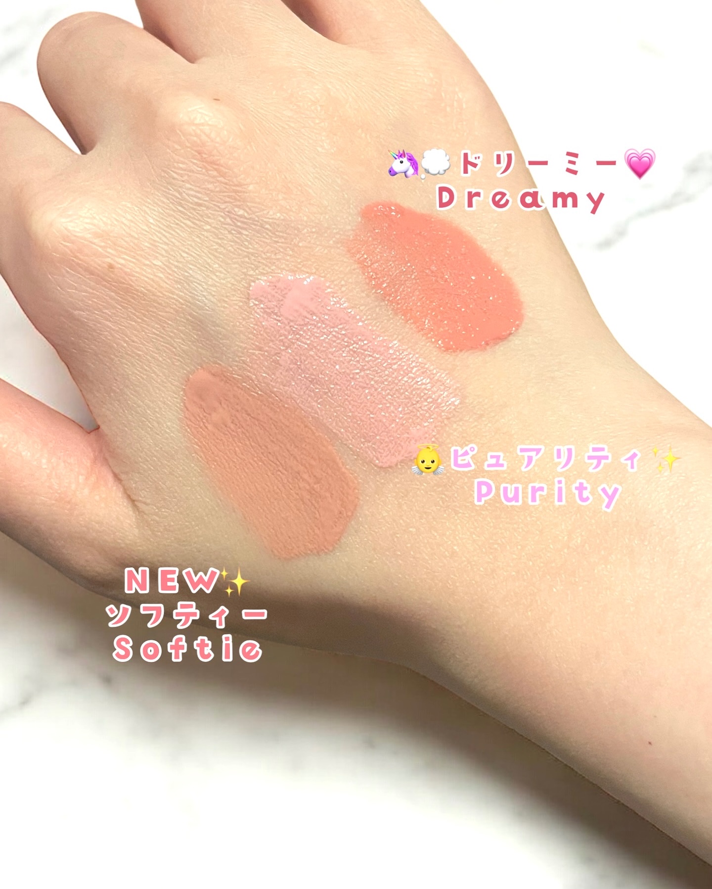 - <ベアリー(BARELY) > 水、シクロペンタシロキサン、グリセリン、メチルトリメチコン、PEG-10ジメチコン、メタクリル酸メチルクロスポリマー、エチルヘキサン酸セチル、ペンチレングリコール、トリエチルヘキサノイン、マイカ、ジステアルジモニウムヘクトライト、酸化チタン、1,2-ヘキサンジオール、トリメチルシロキシケイ酸、(ビニルジメチコン/メチコンシルセスキオキサン)クロスポリマー、硫酸Mg、セチルPEG/PPG-10/1ジメチコン、クロレラエキス、グルコース、酸化鉄、BG、フルクトオリゴ糖、フルクトース、赤226、トリ(カプリル酸/カプリン酸)グリセリル、トリエトキシカプリリルシラン、エチルヘキシルグリセリン、水酸化Al、ラベンダー油、エチレンジアミンジコハク酸3Na、水添レシチン、リナロール、リモネン、グンジョウ、セラミドNP、アルガニアスピノサ核油、シア脂、ツボクサエキス、アーモンド油、カカオ脂、グレープフルーツ果皮油、テトラ(ジ-t-ブチルヒドロキシヒドロケイヒ酸)ペンタエリスリチル、トコフェロール、ダリア花エキス <ドリーミー(DREAMY) > 水、シクロペンタシロキサン、グリセリン、メチルトリメチコン、PEG-10ジメチコン、メタクリル酸メチルクロスポリマー、エチルヘキサン酸セチル、ペンチレングリコール、トリエチルヘキサノイン、マイカ、ジステアルジモニウムヘクトライト、酸化チタン、1,2-ヘキサンジオール、トリメチルシロキシケイ酸、(ビニルジメチコン/メチコンシルセスキオキサン)クロスポリマー、硫酸Mg、セチルPEG/PPG-10/1ジメチコン、クロレラエキス、グルコース、赤226、BG、フルクトオリゴ糖、フルクトース、グンジョウ、酸化鉄、トリ(カプリル酸/カプリン酸)グリセリル、トリエトキシカプリリルシラン、エチルヘキシルグリセリン、ラベンダー油、エチレンジアミンジコハク酸3Na、水酸化Al、水添レシチン、リナロール、リモネン、セラミドNP、アルガニアスピノサ核油、シア脂、ツボクサエキス、アーモンド油、カカオ脂、グレープフルーツ果皮油、テトラ(ジ-t-ブチルヒドロキシヒドロケイヒ酸)ペンタエリスリチル、トコフェロール、ダリア花エキス <グローリー(GLORY) > 水、シクロペンタシロキサン、グリセリン、メチルトリメチコン、PEG-10ジメチコン、メタクリル酸メチルクロスポリマー、マイカ、エチルヘキサン酸セチル、ペンチレングリコール、トリエチルヘキサノイン、ジステアルジモニウムヘクトライト、1,2-ヘキサンジオール、トリメチルシロキシケイ酸、(ビニルジメチコン/メチコンシルセスキオキサン)クロスポリマー、硫酸Mg、酸化チタン、セチルPEG/PPG-10/1ジメチコン、クロレラエキス、グルコース、酸化鉄、BG、フルクトオリゴ糖、フルクトース、グンジョウ、赤226、トリエトキシカプリリルシラン、トリ(カプリル酸/カプリン酸)グリセリル、エチルヘキシルグリセリン、ラベンダー油、エチレンジアミンジコハク酸3Na、水添レシチン、リナロール、水酸化Al、リモネン、セラミドNP、アルガニアスピノサ核油、シア脂、ツボクサエキス、アーモンド油、カカオ脂、グレープフルーツ果皮油、テトラ(ジ-t-ブチルヒドロキシヒドロケイヒ酸)ペンタエリスリチル、トコフェロール、ダリア花エキス <ムーディー(MOODY) > 水、シクロペンタシロキサン、グリセリン、メチルトリメチコン、PEG-10ジメチコン、メタクリル酸メチルクロスポリマー、マイカ、エチルヘキサン酸セチル、ペンチレングリコール、トリエチルヘキサノイン、ジステアルジモニウムヘクトライト、1,2-ヘキサンジオール、トリメチルシロキシケイ酸、(ビニルジメチコン/メチコンシルセスキオキサン)クロスポリマー、硫酸Mg、酸化チタン、セチルPEG/PPG-10/1ジメチコン、クロレラエキス、グルコース、赤226、BG、フルクトオリゴ糖、フルクトース、酸化鉄、トリ(カプリル酸/カプリン酸)グリセリル、トリエトキシカプリリルシラン、エチルヘキシルグリセリン、ラベンダー油、エチレンジアミンジコハク酸3Na、グンジョウ、水添レシチン、リナロール、水酸化Al、リモネン、セラミドNP、アルガニアスピノサ核油、シア脂、ツボクサエキス、アーモンド油、カカオ脂、グレープフルーツ果皮油、テトラ(ジ-t-ブチルヒドロキシヒドロケイヒ酸)ペンタエリスリチル、トコフェロール、ダリア花エキス <タフィー(TAFFY)> 水、シクロペンタシロキサン、グリセリン、メチルトリメチコン、PEG-10ジメチコン、メタクリル酸メチルクロスポリマー、マイカ、エチルヘキサン酸セチル、ペンチレングリコール、トリエチルヘキサノイン、ジステアルジモニウムヘクトライト、1,2-ヘキサンジオール、トリメチルシロキシケイ酸、(ビニルジメチコン/メチコンシルセスキオキサン)クロスポリマー、酸化チタン、硫酸Mg、セチルPEG/PPG-10/1ジメチコン、クロレラエキス、グルコース、BG、フルクトオリゴ糖、フルクトース、赤226、グンジョウ、トリ(カプリル酸/カプリン酸)グリセリル、トリエトキシカプリリルシラン、エチルヘ