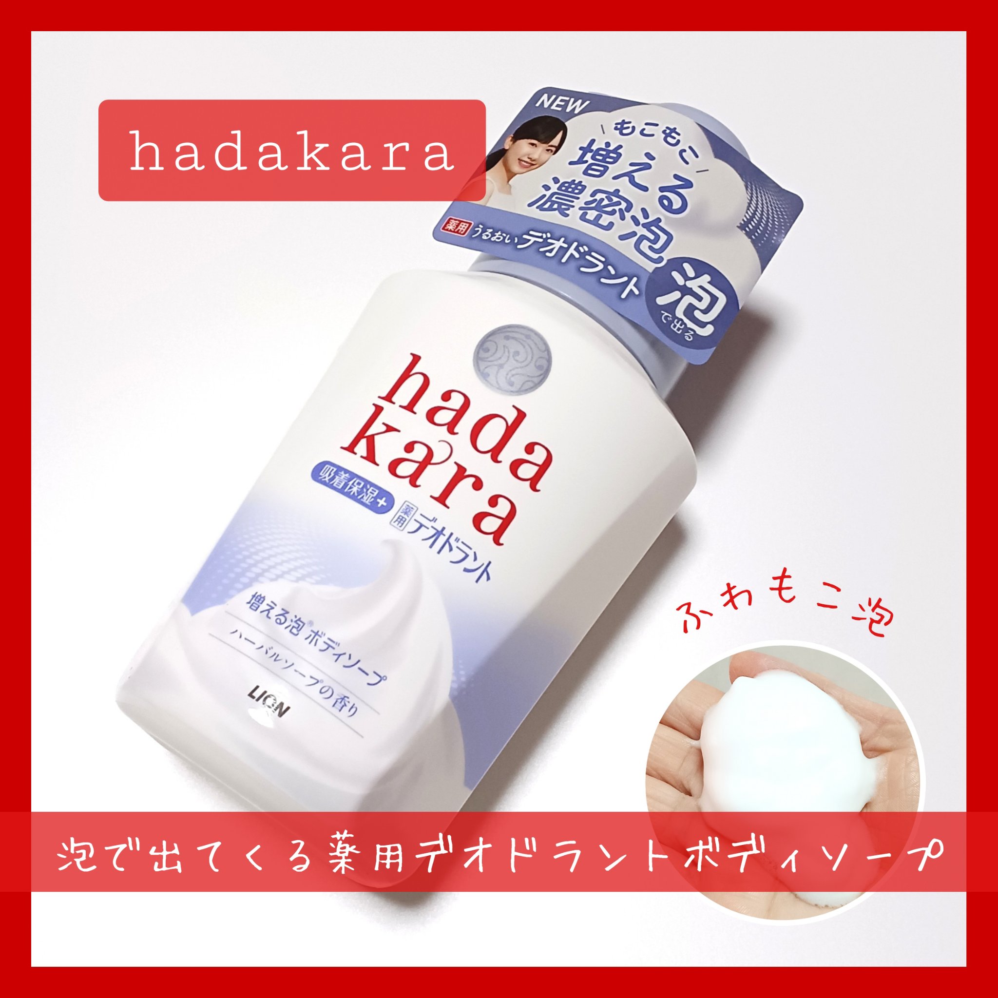 ライオンさまからいただきましたhadakara泡で出てくる薬用デオドラントボディソープをお試しさせていただきました。プッシュするとふわふわの濃密泡が出てきます。泡立てる必要が無く、ふわふわの泡で優しく洗えるのが嬉しいです。もこもこ泡成分で、洗...