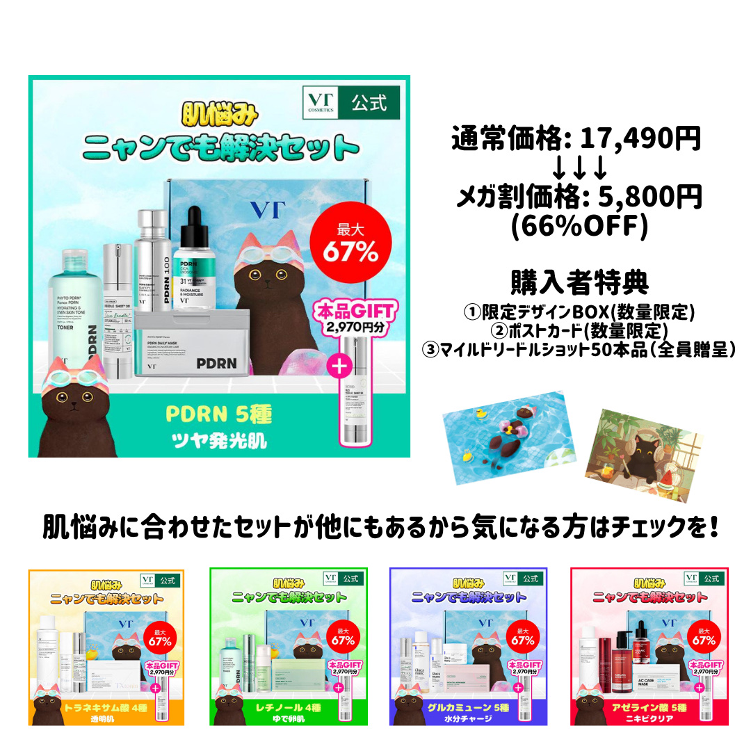 VTからQoo10メガ割期間限定でPDRNセットが登場🥳セット内容:(1)PDRNトナー【新商品!】(2)リードルショット300(3)PDRNデイリーマスク(4)PDRNアンプル/PDRNエッセンス100(4)はアンプル→エッセンスの順で同時...