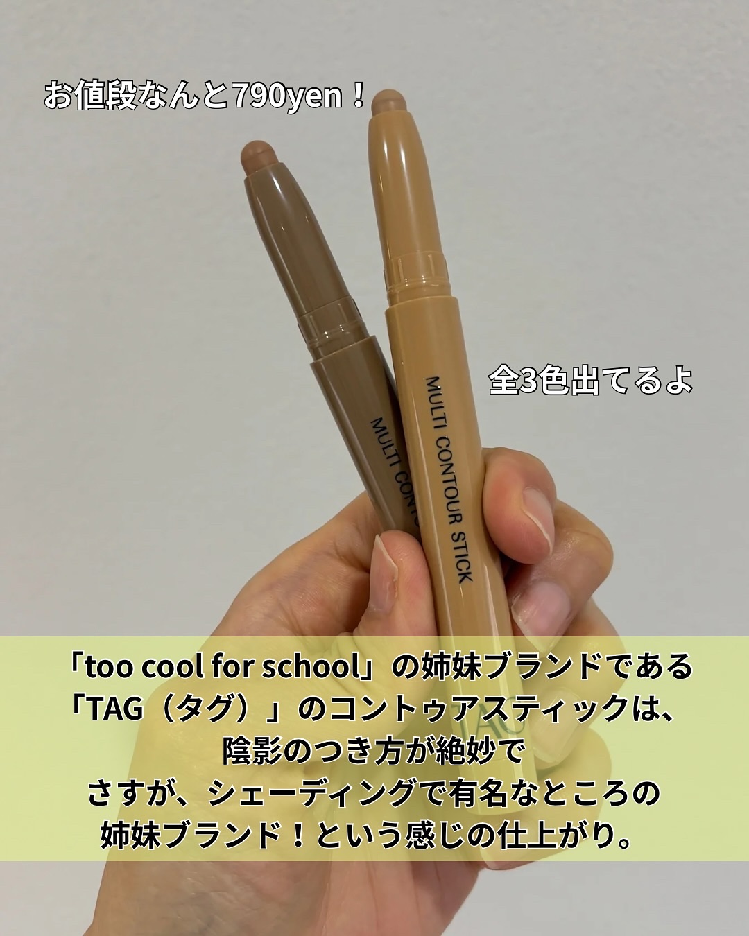TAGのコントゥアスティック🧸🤎「TAG」はシェーディングで有名な「TooCoolForSchool」のダイソーオリジナルブランド!トレンド感と使いやすさを兼ね備えたアイテムが多くて、コスパ最強なのに高クオリティ🫶TAGマルチコントゥアス...