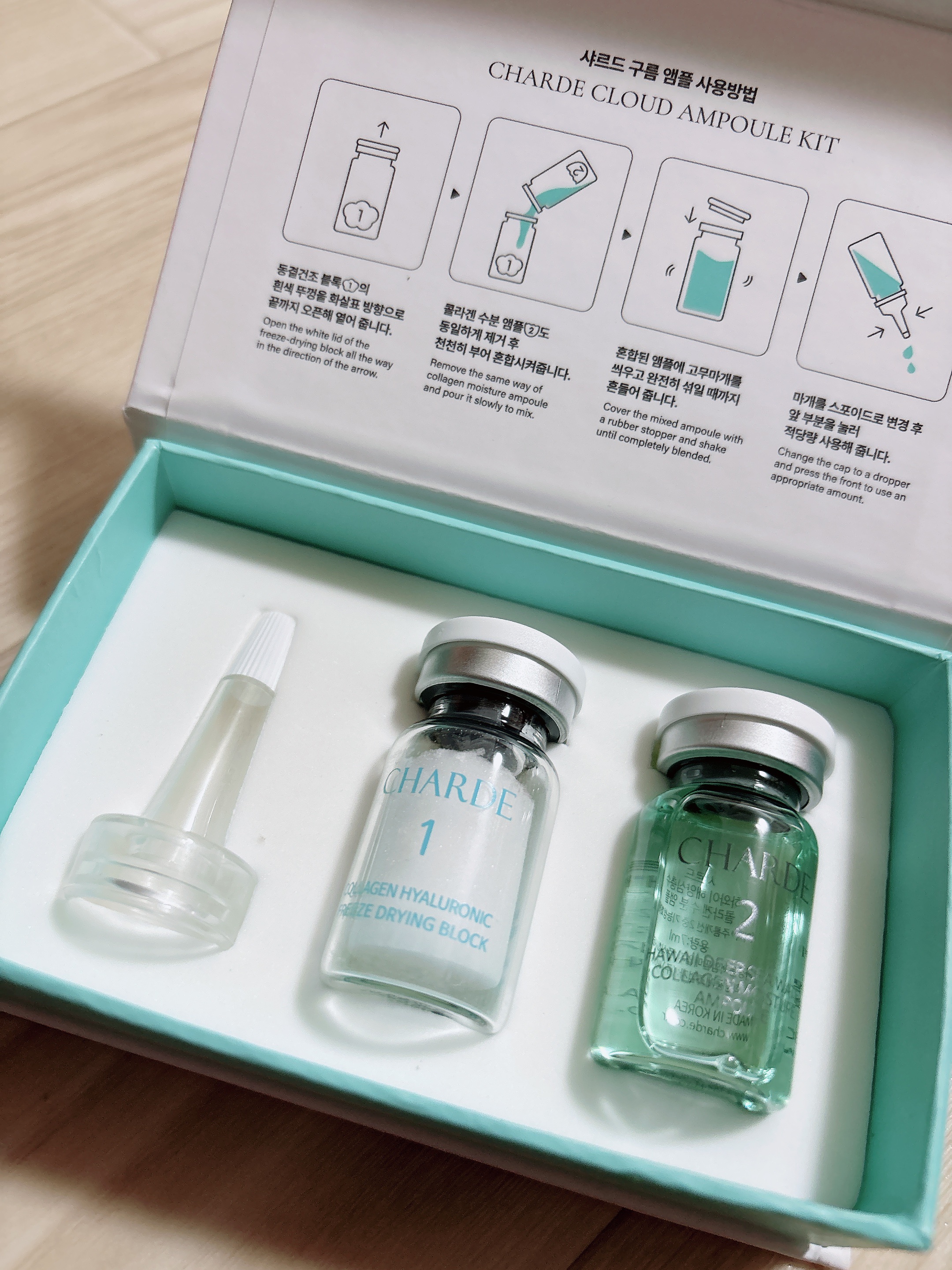 【CHARDEクラウドアンプル】混ぜて完成。雲のようにふんわりとした、うるおい美容液。目をひくのは、1番容器に入ったふわふわのフリーズドライパウダー。まるで雲のようで、見た目にもやさしい印象です。パッケージは爽やかなブルー系。箱を開けると、す...