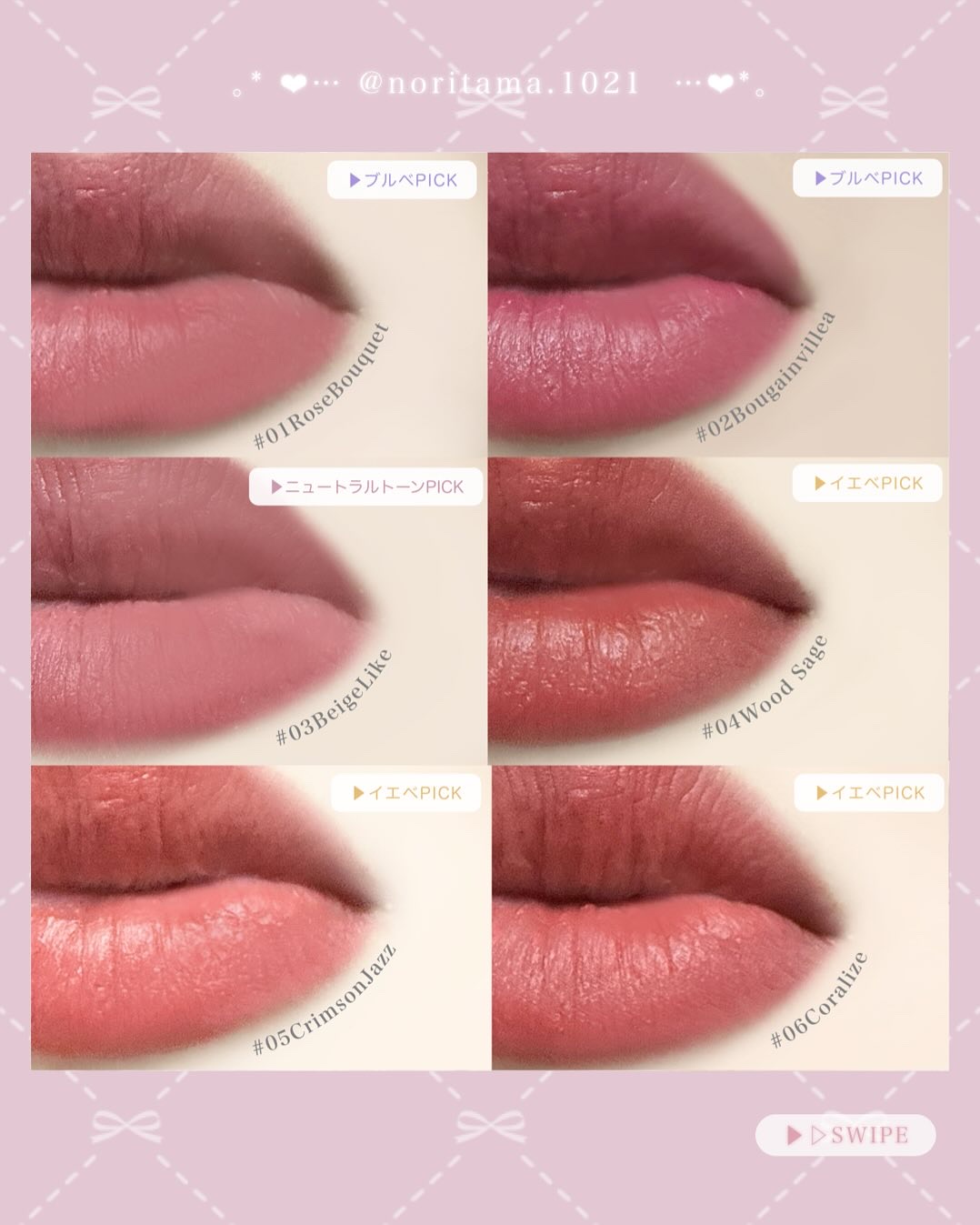新感覚✨6色のカラーが30%、70%の2パターン展開で濃度が選べる😳 プランパー効果があるから、ボリューム感がでて縦じわの目立たない理想的なうるうるリップに… 発色はもちろん、グロス特有のベタつきがなくぷるんと仕上げてくれて乾燥しない使い心地のよさもお気に入り🥹💓