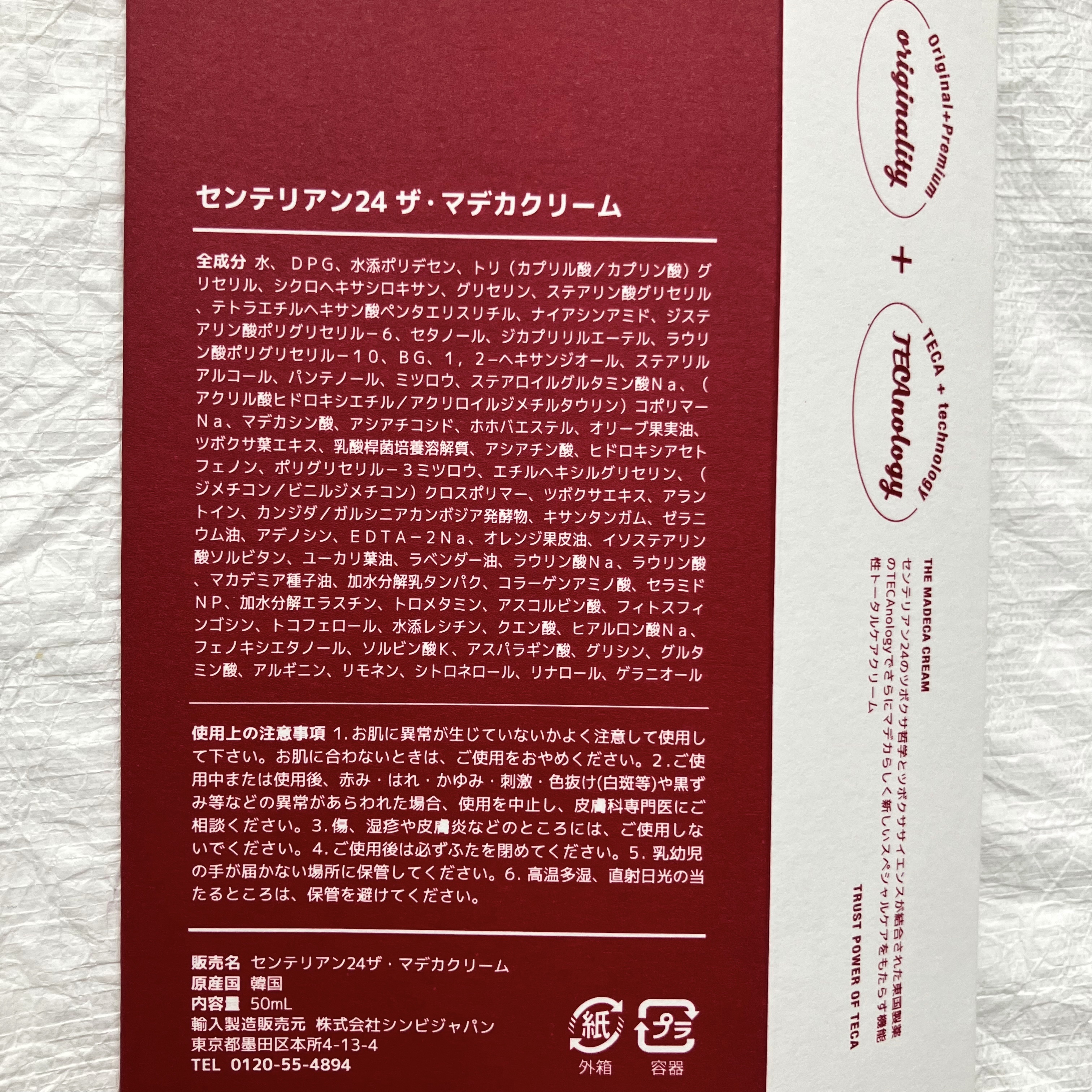 - <50ml> 乳酸菌/ツボクサ発酵エキス液、DPG、水ポリデセン、トリ(カプリル酸/カプリン酸)グリセリル、シクロヘキサシロキサン、グリセリン、テトラエチルヘキサン酸ペンタエリスリチル、ステアリン酸グリセリルナイアシンアミド、ジステアリン酸ポリグリセリルー6、セタノール、ジカプリリルエーテル、ラウリン酸ポリグリセリルー10、BG、1,2-ヘキサンジオール、水、ステアリルアルコール、ミツロウ、パンテノール、ステアロイルグルタミン酸Na、(アクリル酸ヒドロキシエチル/アクリロイルジメチルタウリン) コポリマーN a、マデカシン酸、アシアチコシド、ホホバエステル、オリーブ果実油、アシアチン酸、ヒドロキシアセトフェノン、ポリグリセリルー3ミツロウ、エチルヘキシルグリセリン、(ジメチコン/ ビニルジメチコン)クロスポリマー、ツボクサ油、アラントイン、カンジダ/ガルシニアカンボジア発酵物、キサンタンガム、ゼラニウム油、アデノシン、EDTA-2 Na、オレンジ果皮油、イソステアリン酸ソルビタン ユーカリ葉油、ツボクサ葉エキス、ラベンダー油、ラウリン酸N a、ラウリン酸、加水分解ツボクサタンパク質、マカデミア種子油、アシアチン酸アスコルビル、コラーゲンアミノ酸、セラミドNP、加水分解エラスチン、加水分解ツボクサエキス、トロメタミン、フィトスフィンゴシン、トコフェロール、水添レシチン、クエン酸、ヒアルロン酸N a、フェノキシエタノール、ソルビン酸K、グリシン、グルタミン酸、アルギニン
