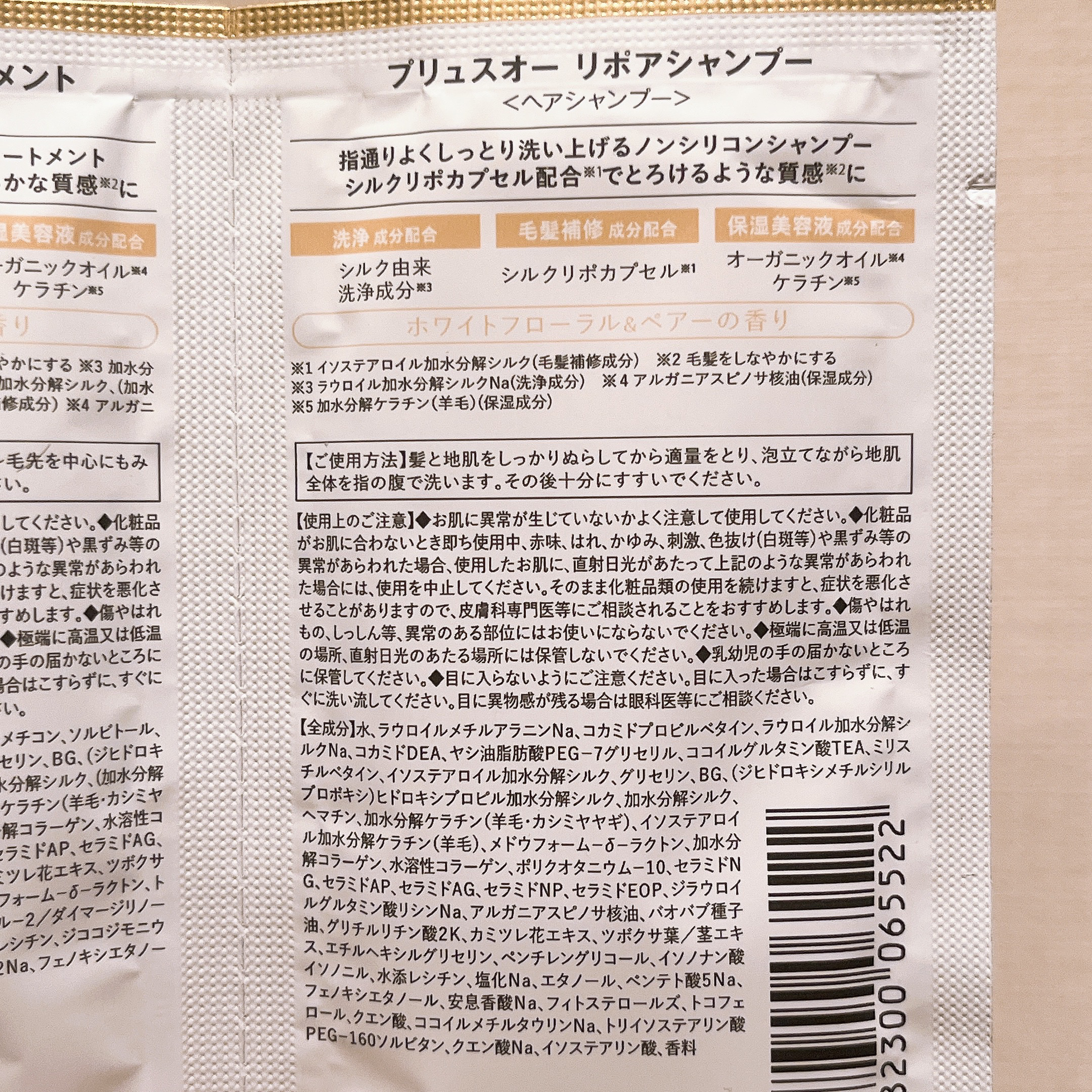 - <シャンプー本体> 水、ラウロイルメチルアラニンNa、コカミドプロピルベタイン、ラウロイル加水分解シルクNa、コカミドDEA、ヤシ油脂肪酸PEG-7グリセリル、ココイルグルタミン酸TEA、ミリスチルベタイン、イソステアロイル加水分解シルク、グリセリン、BG、(ジヒドロキシメチルシリルプロポキシ)ヒドロキシプロピル加水分解シルク、加水分解シルク、ヘマチン、加水分解ケラチン(羊毛・カシミヤヤギ)、イソステアロイル加水分解ケラチン(羊毛)、メドウフォーム-δ-ラクトン、加水分解コラーゲン、水溶性コラーゲン、ポリクオタニウム-10、セラミドNG、セラミドAP、セラミドAG、セラミドNP、セラミドEOP、ジラウロイルグルタミン酸リシンNa、アルガニアスピノサ核油、バオバブ種子油、グリチルリチン酸2K、カミツレ花エキス、ツボクサ葉/茎エキス、エチルヘキシルグリセリン、ペンチレングリコール、イソノナン酸イソノニル、水添レシチン、塩化Na、エタノール、ペンテト酸5Na、フェノキシエタノール、安息香酸Na、フィトステロールズ、トコフェロール、クエン酸、ココイルメチルタウリンNa、トリイソステアリン酸PEG-160ソルビタン、クエン酸Na、イソステアリン酸、香料 <トリートメント本体> 水、パルミチン酸エチルヘキシル、セテアリルアルコール、ジメチコン、ソルビトール、ベヘントリモニウムクロリド、イソステアロイル加水分解シルク、グリセリン、BG、(ジヒドロキシメチルシリルプロポキシ)ヒドロキシプロピル加水分解シルク、加水分解シルク、(加水分解シルク/PGプロピルメチルシランジオール)クロスポリマー、加水分解ケラチン(羊毛・カシミヤヤギ)、イソステアロイル加水分解ケラチン(羊毛)、ヘマチン、加水分解コラーゲン、水溶性コラーゲン、アルガニアスピノサ核油、バオバブ種子油、セラミドNG、セラミドAP、セラミドAG、セラミドNP、セラミドEOP、ジラウロイルグルタミン酸リシンNa、カミツレ花エキス、ツボクサ葉/茎エキス、ポリクオタニウム-10、ポリクオタニウム-51、メドウフォーム-δ-ラクトン、トコフェロール、ペンチレングリコール、(イソステアリン酸ポリグリセリル-2/ダイマージリノール酸)コポリマー、イソノナン酸イソノニル、フィトステロールズ、水添レシチン、ジココジモニウムクロリド、エタノール、乳酸、イソステアリン酸、乳酸Na、EDTA-2Na、フェノキシエタノール、イソプロパノール、香料 <シャンプー 詰替え> 水、ラウロイルメチルアラニンNa、コカミドプロピルベタイン、ラウロイル加水分解シルクNa、コカミドDEA、ヤシ油脂肪酸PEG-7グリセリル、ココイルグルタミン酸TEA、ミリスチルベタイン、イソステアロイル加水分解シルク、グリセリン、BG、(ジヒドロキシメチルシリルプロポキシ)ヒドロキシプロピル加水分解シルク、加水分解シルク、ヘマチン、加水分解ケラチン(羊毛・カシミヤヤギ)、イソステアロイル加水分解ケラチン(羊毛)、メドウフォーム-δ-ラクトン、加水分解コラーゲン、水溶性コラーゲン、ポリクオタニウム-10、セラミドNG、セラミドAP、セラミドAG、セラミドNP、セラミドEOP、ジラウロイルグルタミン酸リシンNa、アルガニアスピノサ核油、バオバブ種子油、グリチルリチン酸2K、カミツレ花エキス、ツボクサ葉/茎エキス、エチルヘキシルグリセリン、ペンチレングリコール、イソノナン酸イソノニル、水添レシチン、塩化Na、エタノール、ペンテト酸5Na、フェノキシエタノール、安息香酸Na、フィトステロールズ、トコフェロール、クエン酸、ココイルメチルタウリンNa、トリイソステアリン酸PEG-160ソルビタン、クエン酸Na、イソステアリン酸、香料 <トリートメント 詰替え> 水、パルミチン酸エチルヘキシル、セテアリルアルコール、ジメチコン、ソルビトール、ベヘントリモニウムクロリド、イソステアロイル加水分解シルク、グリセリン、BG、(ジヒドロキシメチルシリルプロポキシ)ヒドロキシプロピル加水分解シルク、加水分解シルク、(加水分解シルク/PGプロピルメチルシランジオール)クロスポリマー、加水分解ケラチン(羊毛・カシミヤヤギ)、イソステアロイル加水分解ケラチン(羊毛)、ヘマチン、加水分解コラーゲン、水溶性コラーゲン、アルガニアスピノサ核油、バオバブ種子油、セラミドNG、セラミドAP、セラミドAG、セラミドNP、セラミドEOP、ジラウロイルグルタミン酸リシンNa、カミツレ花エキス、ツボクサ葉/茎エキス、ポリクオタニウム-10、ポリクオタニウム-51、メドウフォーム-δ-ラクトン、トコフェロール、ペンチレングリコール、(イソステアリン酸ポリグリセリル-2/ダイマージリノール酸)コポリマー、イソノナン酸イソノニル、フィトステロールズ、水添レシチン、ジココジモニウムクロリド、エタノール、乳酸、イソステアリン酸、乳酸Na、EDTA-2Na、フェノキシエタノール、イソプロパノール、香料