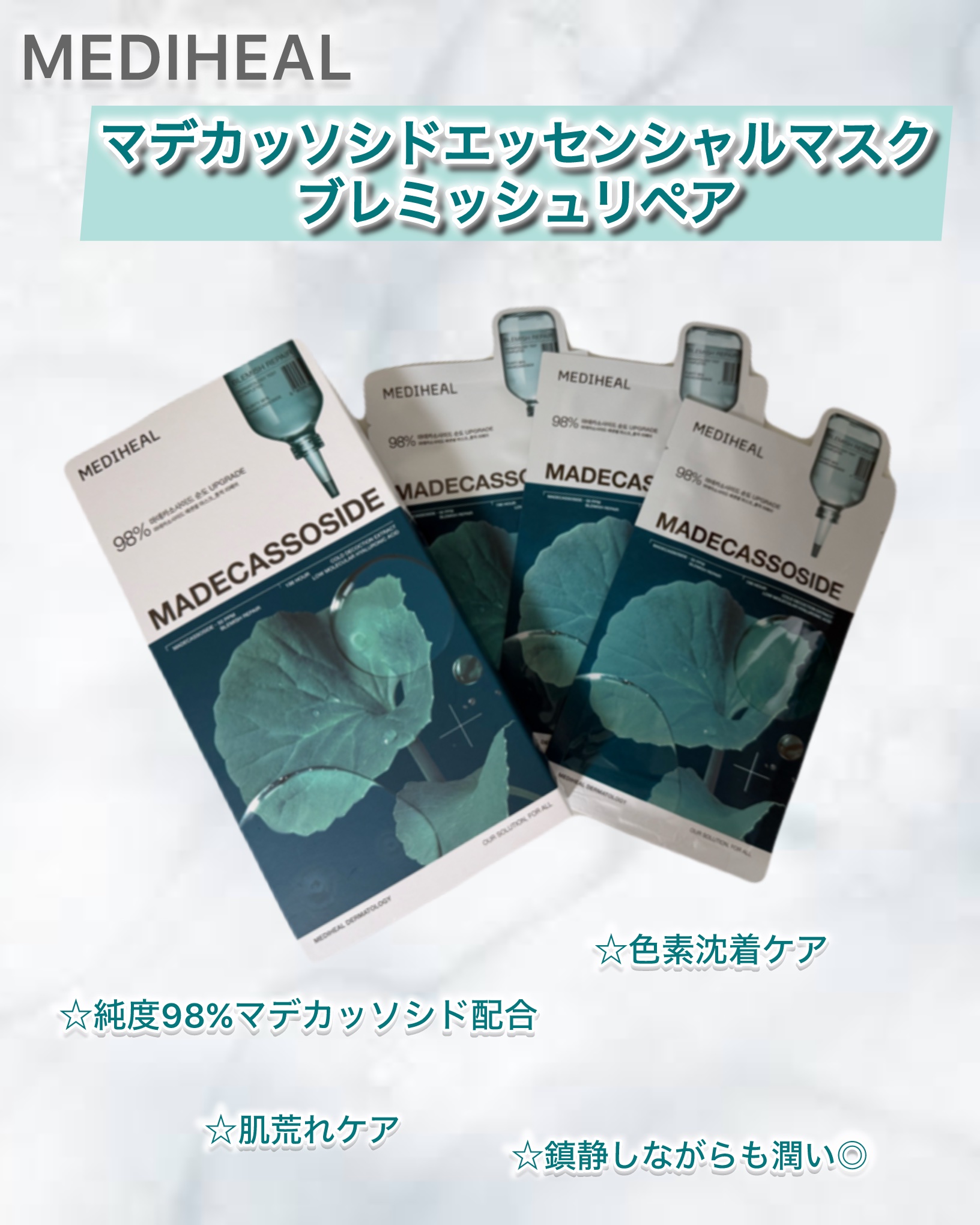 @mediheal.jp.official様よりいただきました💙マデカッソシドエッセンシャルマスクブレミッシュリペア販売数第一位のメディヒールの人気パック🩶純度98%のマデカッソシドが配合されていて、水分感たっぷりのパックになっています🚿保湿...