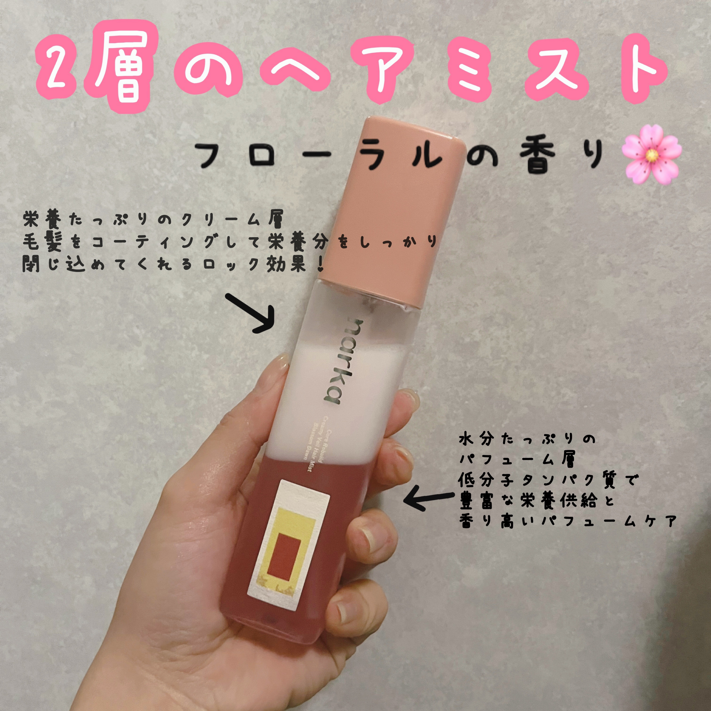 振って使うタイプのヘアケアミスト🩷 水分とクリームって珍しいよね🥺🫶🏻 これまじでめちゃくちゃ柔らかいミスト! 私が使ってきたヘアミストの中で1番じゃないかってぐらい柔らかく噴霧する🌬️ 香りの持ちも結構良いよ!! ナルカ優秀🥺◎
