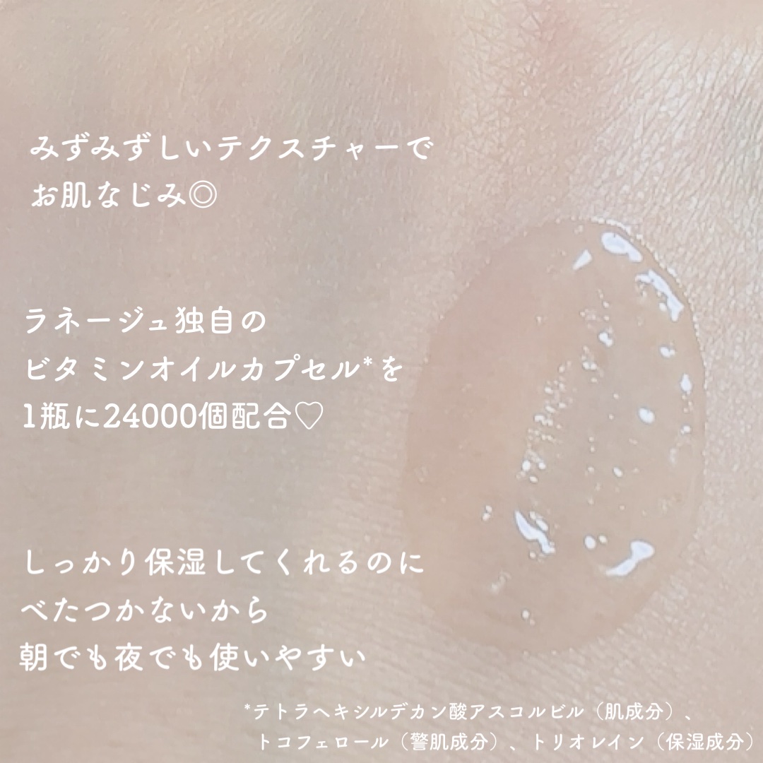 - LIPSベストコスメ受賞の「バウンシースリーピングマスク」から美容液「バウンシーセラム」が登場! ラネージュ独自のビタミンオイルカプセル*¹が1瓶に24,000個配合。 バウンシーシリーズ共通のピオニー&コラーゲンコンプレックス™*²や4種のペプチド*³配合で、 すみわたるような輝き*⁴とキメの整ったなめらかなハリツヤ肌へと導くアーリーエイジングケア*⁵美容液。 *¹ テトラヘキシルデカン酸アスコルビル(整肌成分)、トコフェロール(整肌成分)、トリオレイン(保湿成分) ※30mL(現品)に24,000個のカプセルを配合 *² シャクヤク花エキス、シャクヤク根エキス、水溶性コラーゲン(整肌うるおい保持成分) *³ アセチルヘプタペプチド-4、アセチルヘキサペプチド-8、アセチルオクタペプチド-3、アセチルテトラペプチド-2 (いずれも保湿成分) *⁴ うるおいによる *⁵ 年齢による肌のお手入れのこと