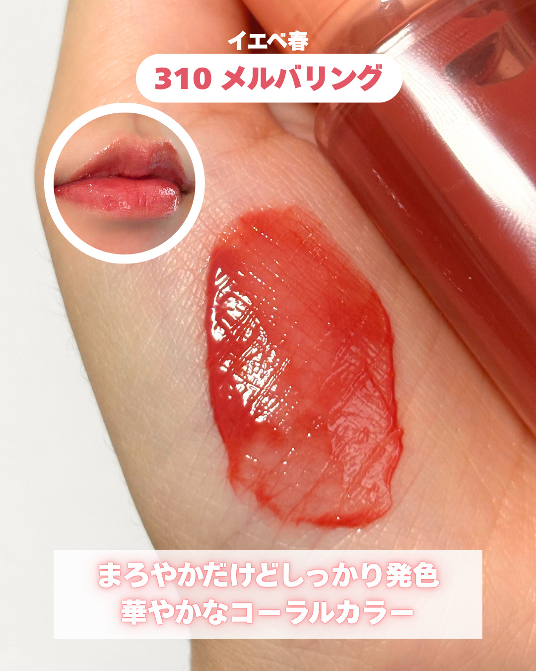 光沢感が素敵なティントです💓 くすみのあるカラーがいいなと思って510にしました。 付けたては想像通りでしたが、数分経つと何故か凄い赤ピンクになってた😂 色は残ってくれる感じでしたが、特に唇の内側が濃くなりやすいかも。 パッケージの色味がめちゃくちゃ可愛い🩷 でも1,980円出すなら他のティントでもいいかなーと思ったよ!
